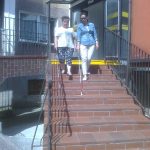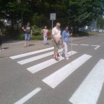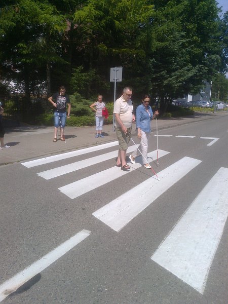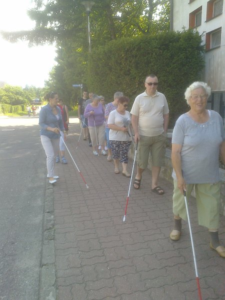 Na zajęciach z orientacji przestrzennej omówiono posługiwanie się laską. Każdy uczestnik wraz z przewodnikiem uczył się, jak prowadzić osobę niewidomą po schodach, omijania napotkanych przeszkód, przeprowadzania osoby niewidomej przez drzwi w trakcie ich otwierania i zamykania. Poruszania się po chodnikach i bezpiecznego przechodzenia przez jezdnię.
