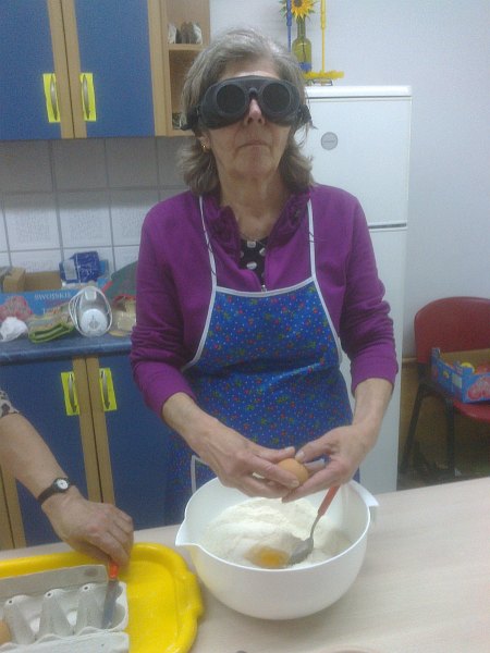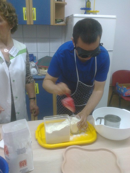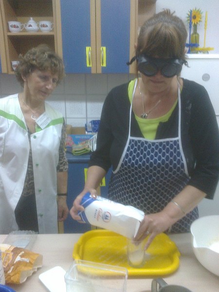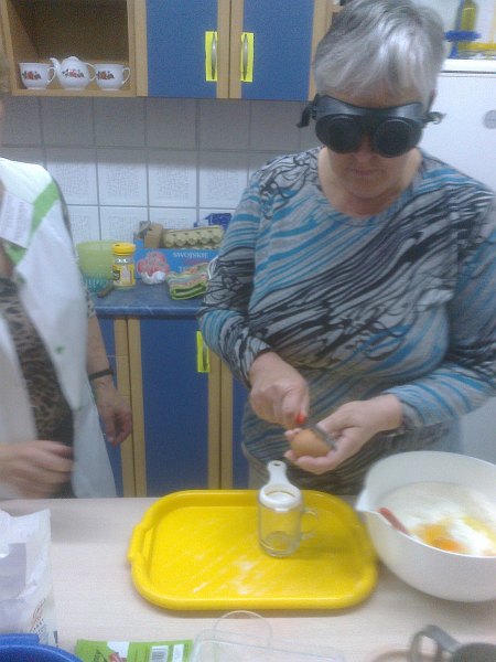 Uczestnicy szkolenia piekąc ciasta samodzielnie nalewali olej, odmierzali mąkę, rozbijali jajka wykonywali wszystkie czynności, które na co dzień wykonuje się w domu – czynności dla zapewnienia odpowiedniego przeszkolenia osób, które widzą wykonywane były w specjalistycznych okularach (gogle, przez które nic nie widać) są one używane na tego typu szkoleniach.
