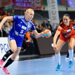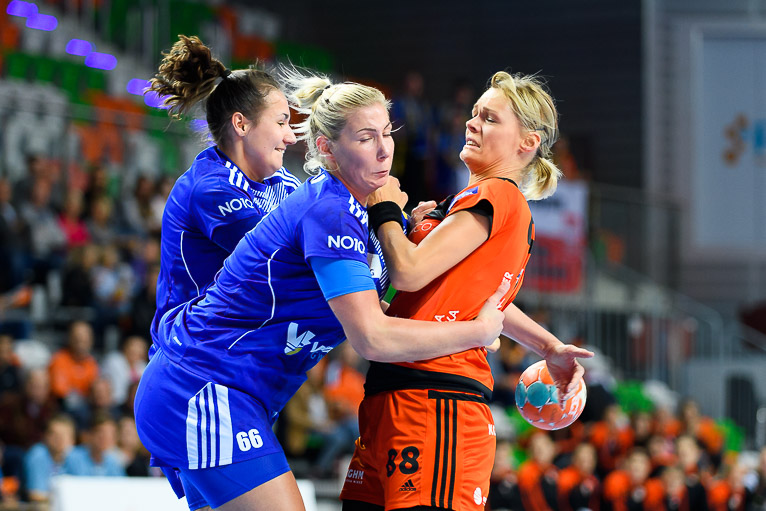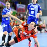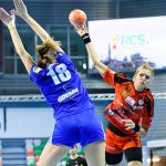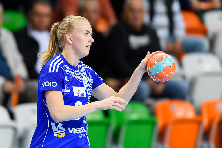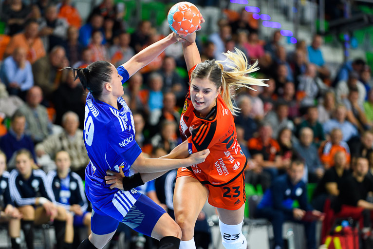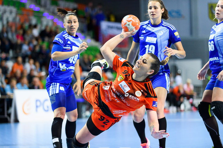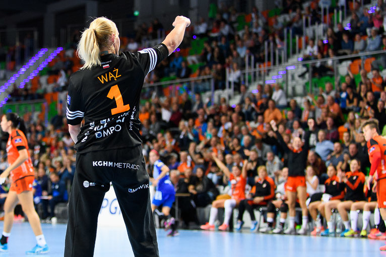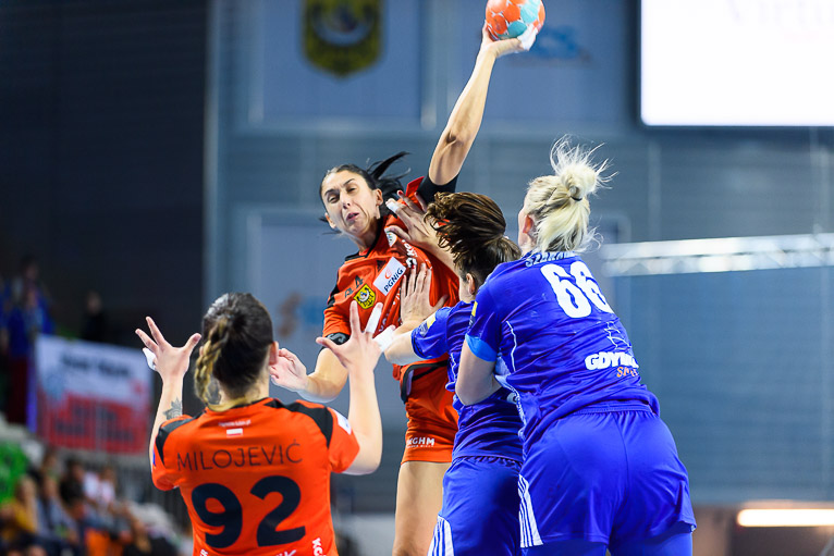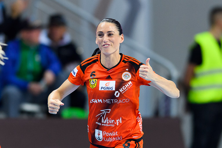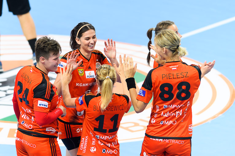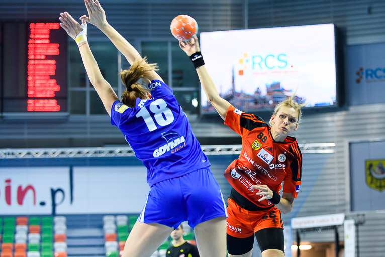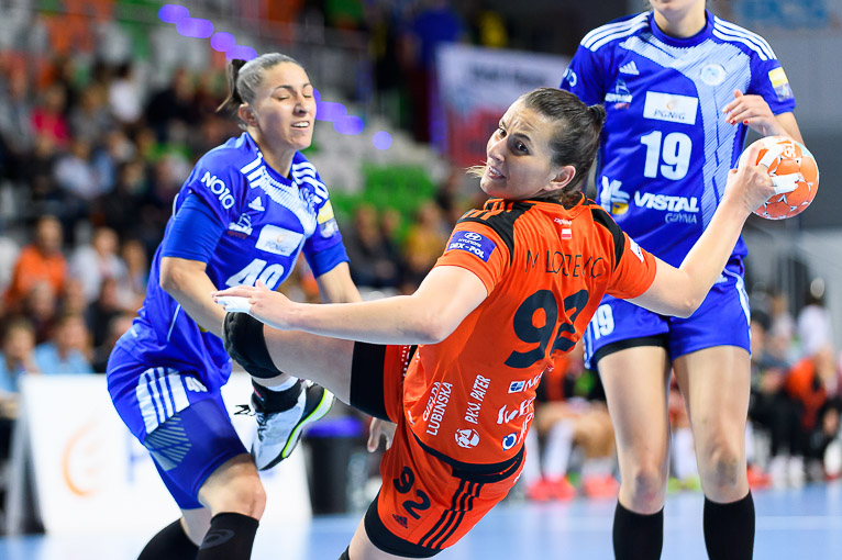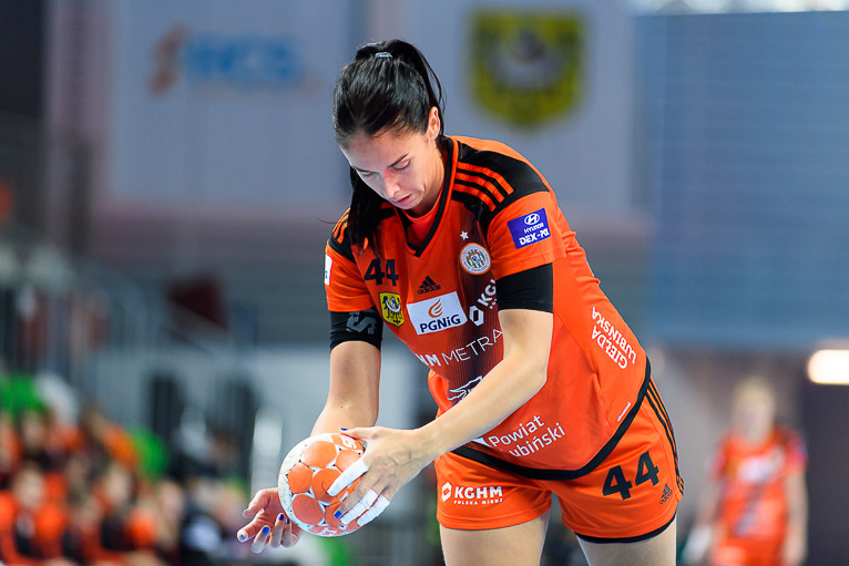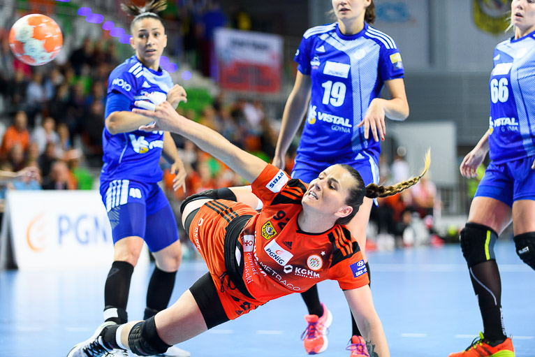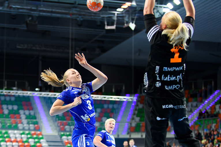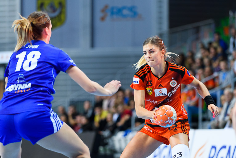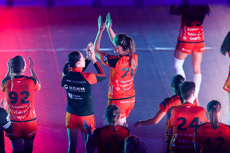Vistal zgubił piłkę w ataku i po chwili przegrywał 0:1. Atomowym rzutem z drugiej linii popisała się Żana Marić. Na jej bramkę odpowiedziała Patricia Matieli, ale kilkanaście sekund później z koła po podaniu Marić rzuciła Jovana Milojević. Na pierwsze prowadzenie w meczu – 3:2 gdynianki wyszły w czwartej minucie. W 11. minucie, przy wyniku 5:6, Monikę Maliczkiewicz w bramce zmieniła Monika Wąż, która od razu popisała się udaną interwencją. To dało sygnał jej koleżankom z drużyny, które rzuciły dwie bramki z rzędu i odzyskały prowadzenie. Pierwsza połowa mogła się podobać kibicom, emocji nie brakowało, a wynik cały czas był na „styku’. Na dwie bramki miedziowym udało się odskoczyć w 20. minucie, po trafieniu Aliny Wojtas.  Do szatni lubinianki, głównie za sprawą świetnie spisującej się w bramce Moniki Wąż i bezbłędnej Żany Marić, schodziły wygrywając 14:13.