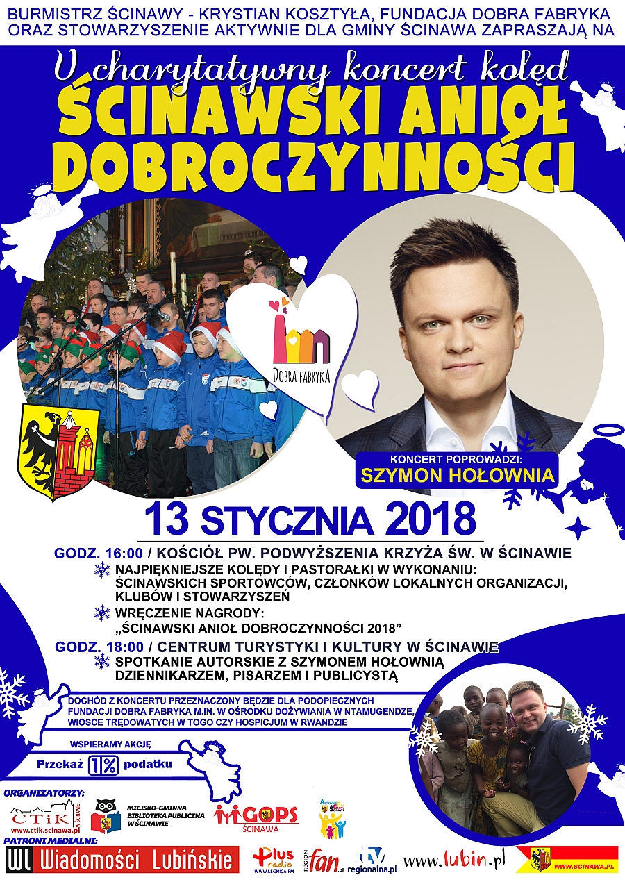 Ścinawianie już wiele udowodnili, że są ludźmi dobrego serca. Kolejną okazją do wsparcia potrzebujących będzie koncert kolęd i pastorałek pod nazwą „Ścinawski Anioł Dobroczynności”, który organizowany jest już po raz piąty. Poprowadzi go znany dziennikarz Szymon Hołownia.