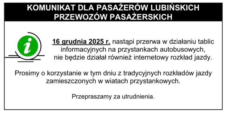Ważna informacja dla pasażerów autobusów Lubińskich Przewozów Pasażerskich. Jutro, czyli we wtorek 16 grudnia, wyłączone zostaną wszystkie tablice informacyjne znajdujące się na przystankach w Lubinie oraz internetowy rozkład jazdy.