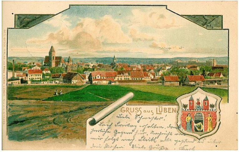 Widok na Lubin od strony południowo-zachodniej, ale już w kolorze. W dolnej prawej części pocztówki widoczny jest ówczesny herb Lubina. W herbie miasta, po obu stronach bramy stojące postacie kobiece – każda z pucharem w ręku. Wszystko wskazuje na to, że są to Święta Barbara i Święta Anna. Obecność w herbie Świętej Barbary jest bardzo intrygująca oraz prorocza dla dzisiejszego górniczego miasta i LGOM-u (Zagłębia Miedziowego).