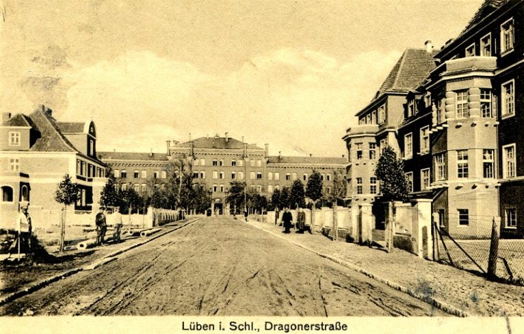 Ciekawe ujęcie obecnej ulicy Bankowej (Dragonerstraβe) z widokiem na ówczesne duże koszary – obecnie Zespół Szkół nr 1 im. prof. B. Krupińskiego.