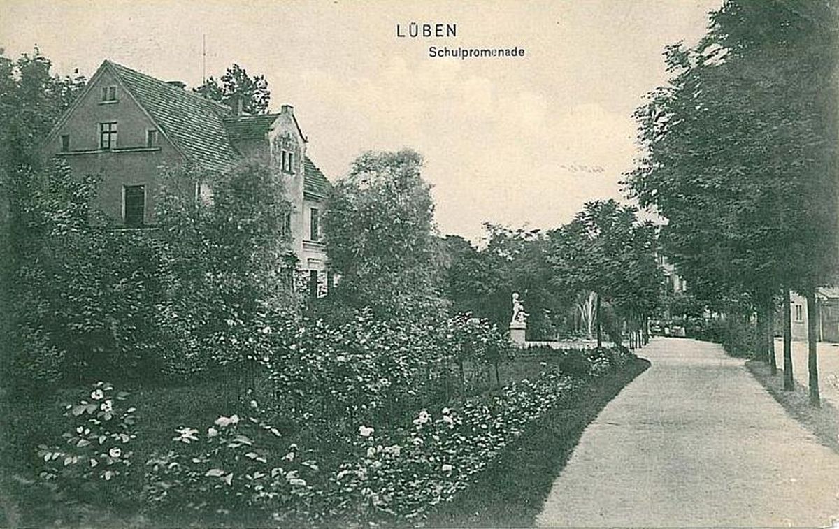 Promenada i wszystkie tereny zielone wokół lubińskiej starówki urządzono w miejscu, gdzie przebiegała stara fosa otaczająca miasto. Budynek po lewej stronie pocztówki istnieje do dzisiaj. Przed wojną, w różnych okresach wykorzystywany był przez różne szkoły. W tym miejską szkołę dla dziewcząt. Po wojnie także przez wiele lat jego użytkownikami były instytucje, najszerzej ujmując, oświatowe.