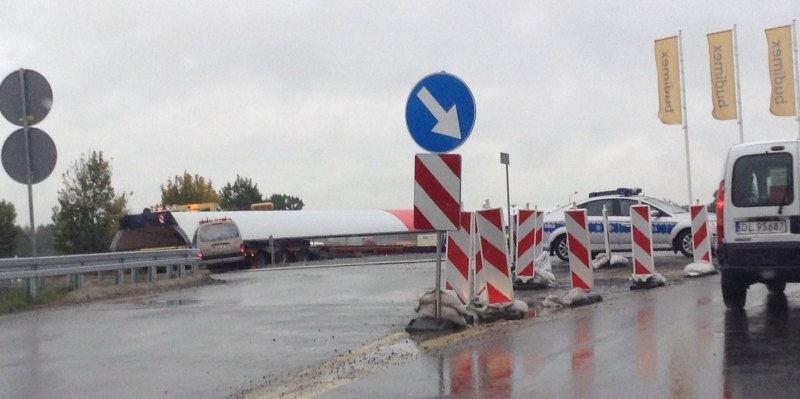 Wszyscy, którzy dziś rano jechali z Lubina do Legnicy musieli stać w gigantycznym korku. Na rondzie przy zjeździe w kierunku Rzeszotar utknął tir przewożący śmigła, tzw. pojazd gabarytowy.