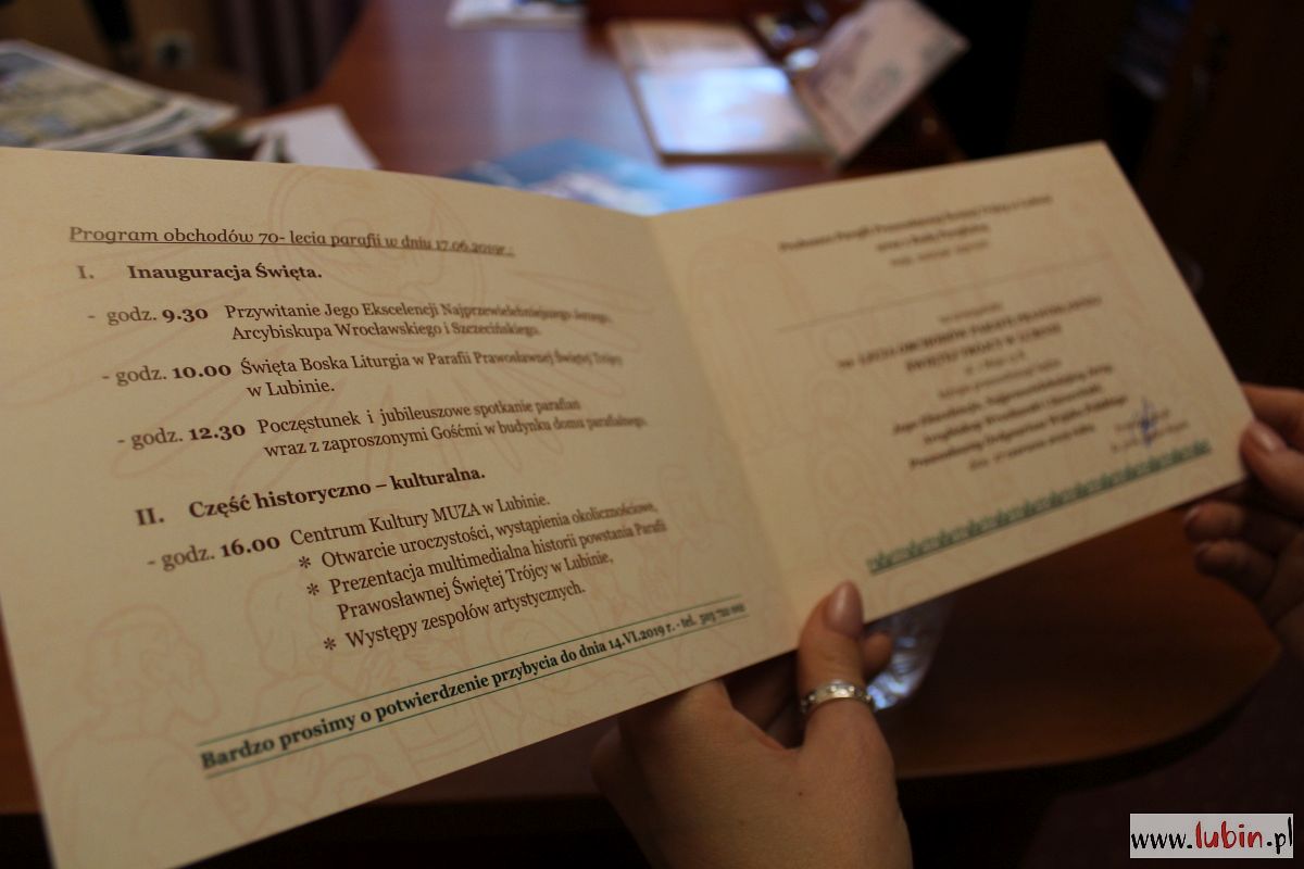 Więcej o historii lubińskiej parafii prawosławnej będzie można dowiedzieć się podczas uroczystości rocznicowych, które zaplanowano na poniedziałek 17 czerwca. Najpierw, o godzinie 10, odbędzie się święta boska liturgia w parafii prawosławnej Świętej Trójcy, której przewodniczyć będzie prawosławny arcybiskup wrocławsko-szczeciński Jerzy. Zaś o godzinie 16 w Centrum Kultury Muza zaplanowano spotkanie, na którym będzie można posłuchać o historii, a także obejrzeć występy artystyczne.