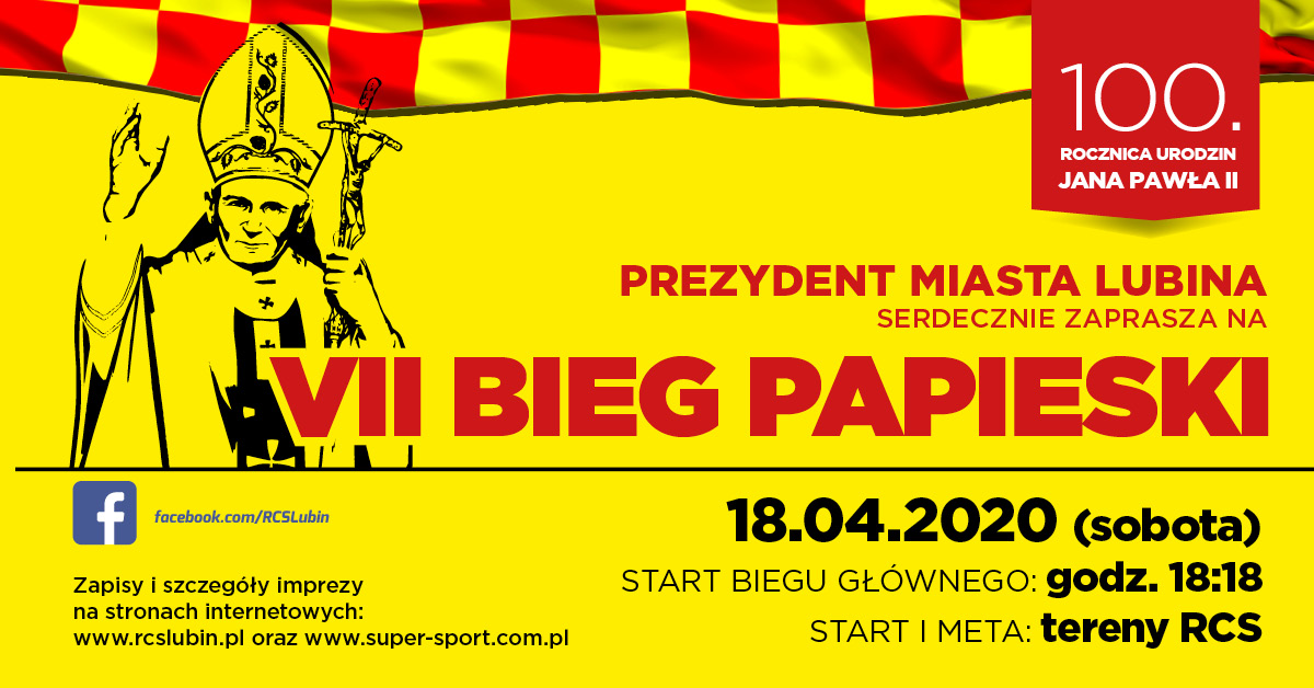 Po raz siódmy RCS ma przyjemność zaprosić wszystkich miłośników biegania do udziału w Biegu Papieskim. Start VII Biegu Papieskiego odbędzie się 18 kwietnia 2020r. o godz. 18.18 spod Hali Widowiskowo-Sportowej w Lubinie.