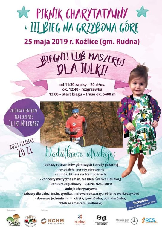 Można zdobyć najwyższe wzniesienie w powiecie lubińskim oraz wspomóc szczytny cel. Dobra zabawa i pomaganie mogą iść w parze – przed nami, już w sobotę 25 maja, III Bieg na Grzybową Górę połączony z piknikiem charytatywnym. Podczas imprezy odbędzie się zbiórką na małą lubiniankę Julię Nieckarz, która urodziła się bez niektórych kości w nogach. Pomóżmy uratować jej nóżki, aby w przyszłości sama miała szansę wbiec na Grzybową Górę. A do tego zumba, fitness na trampolinach, rękodzieło i domowe jedzenie oraz koncert m.in. Świnki Halinki.