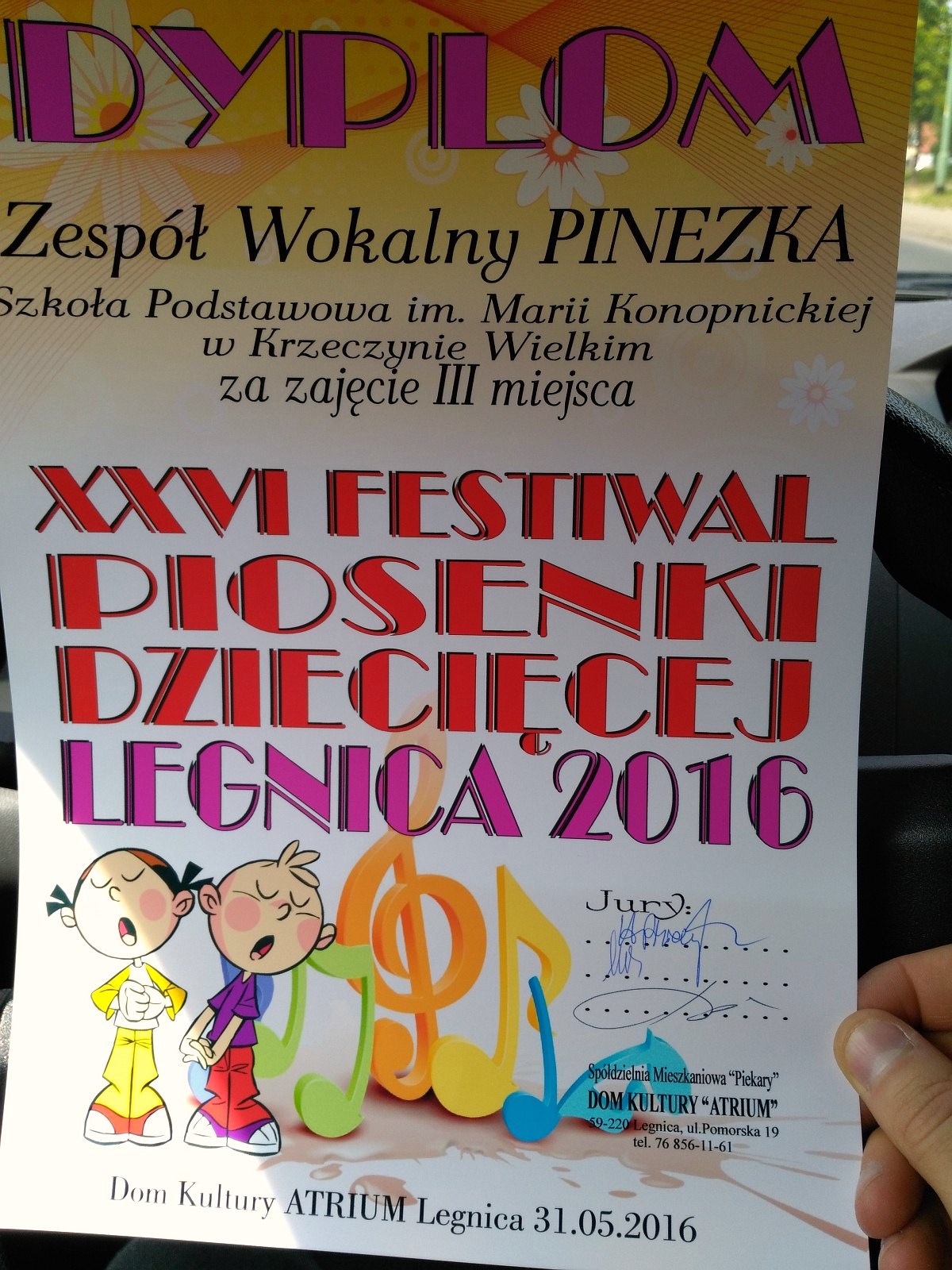 Zespół Wokalny Pinezka ze Szkoły Podstawowej im. Marii Konopnickiej w Krzeczynie Wielkim wziął udział w XXVI Festiwalu Piosenki Dziecięcej, zdobywając III miejsce.