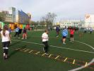Spotkanie rozpoczęło się od wspólnej rozgrzewki, która miała przygotować młodzież do wykonania treningu stacyjnego żłożonego z ćwiczeń wykorzystywanych w treningach futbolu amerykańskiego. Uczniowie mieli okazję zmierzyć się z wielką oponą od traktora, rzutami na specjalny worek w ramach ćwiczenia, obaleń przeciwnika czy też kombinacjami ruchów wykonywanych na popularnej "drabince". Na każdej ze stacji uczestnikom towarzyszyli zawodnicy czuwając nad techniką wykonywanych ćwiczeń. Pomimo sporego wysiłku fizycznego całośc przebiegałą w atmosferze dobrej zabawy, a śmiechom nie było końca zarówno z boiska jak i trybun.