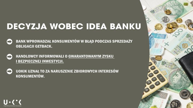 Idea Bank wprowadzał konsumentów w błąd podczas sprzedaży obligacji korporacyjnych GetBack – uznał prezes UOKiK. Wydana decyzja częściowa będzie istotnym wsparciem dla poszkodowanych w dochodzeniu roszczeń. To nie koniec działań urzędu w sprawie Idea Banku.