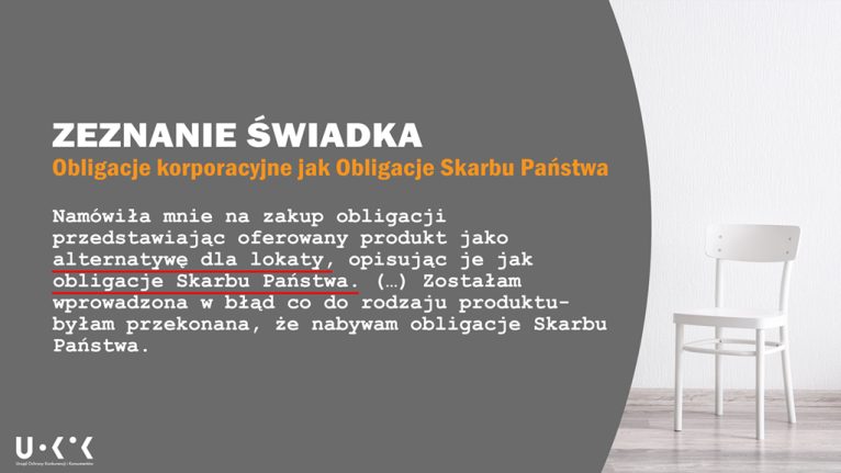 – Namówiła mnie na zakup obligacji przedstawiając oferowany produkt jako alternatywę dla lokaty, opisując je jak obligacje Skarbu Państwa. (…) Zostałam wprowadzona w błąd co do rodzaju produktu – byłam przekonana, że nabywam obligacje Skarbu Państwa.