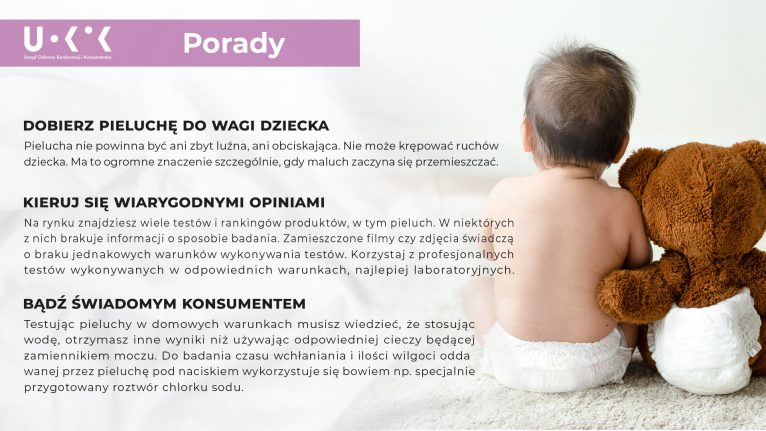 Wybór odpowiednich pieluch dla dziecka niejednego rodzica przyprawia o zawrót głowy. Z pomocą przychodzi Urząd Ochrony Konkurencji i Konsumentów. W akredytowanych laboratoriach UOKiK w Lublinie oraz w Łodzi sprawdzono 10 marek pieluszek w rozmiarze „3” przeznaczonych dla dzieci o wadze od 4 do 10 kg. Zostały one wybrane przez Inspekcję Handlową na podstawie rozeznania rynku.