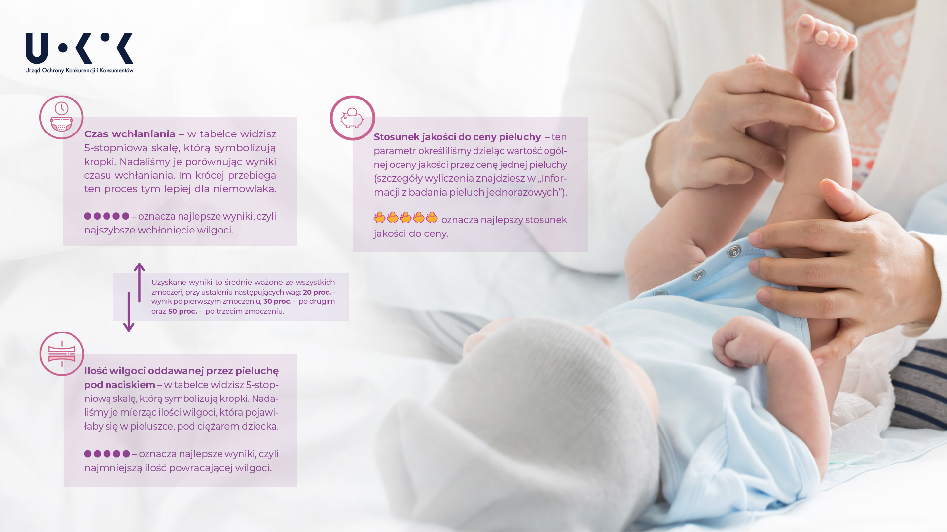 – W kolejnej odsłonie z cyklu „UOKiK testuje” porównaliśmy 10 marek pieluch jednorazowych, które przebadaliśmy w naszych akredytowanych laboratoriach. Badania UOKiK są rzetelne, niezależne i wiarygodne. Parametry, które analizujemy, wybieramy zawsze z myślą o konsumentach tak, aby dostarczyć im przydatnych informacji i wartościowych ocen. Wyniki badania pieluch również dla nas okazały się dużym zaskoczeniem, w szczególności względem marek posiadających bodajże najlepszą rozpoznawalność na polskim rynku. Mam jednak nadzieję, że po lekturze raportu wybór pieluch będzie dla Państwa nieco łatwiejszy – mówi Prezes UOKiK Tomasz Chróstny.
