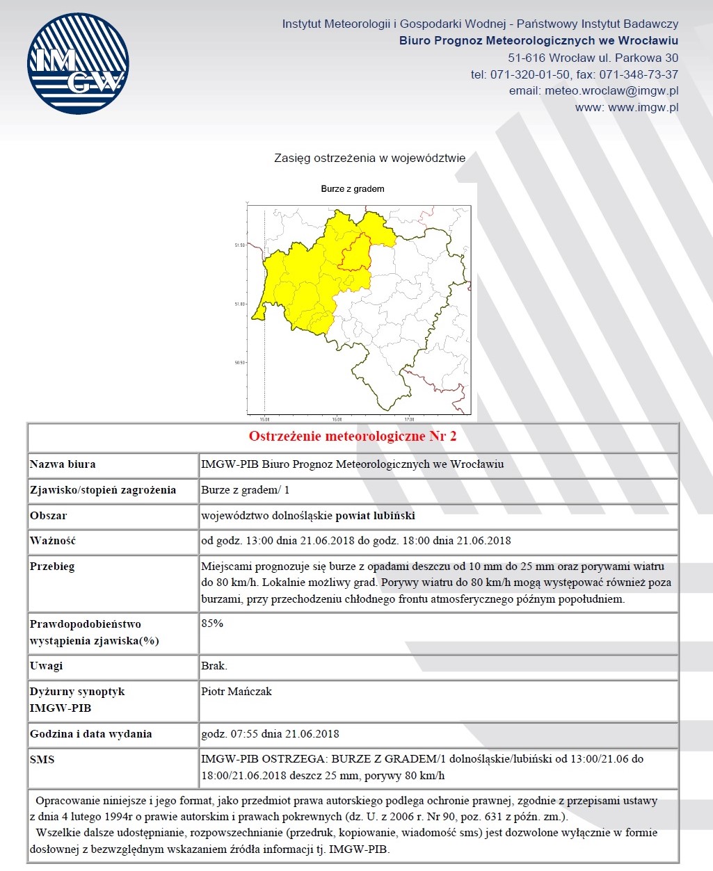 Na Dolnym Śląsku ostrzeżenie pierwszego stopnia wydano także dla powiatów: bolesławieckiego, głogowskiego, górowskiego, Jeleniej Góry, jeleniogórskiego, Legnicy, legnickiego, lubańskiego, lwóweckiego, polkowickiego, zgorzeleckiego i złotoryjskiego.