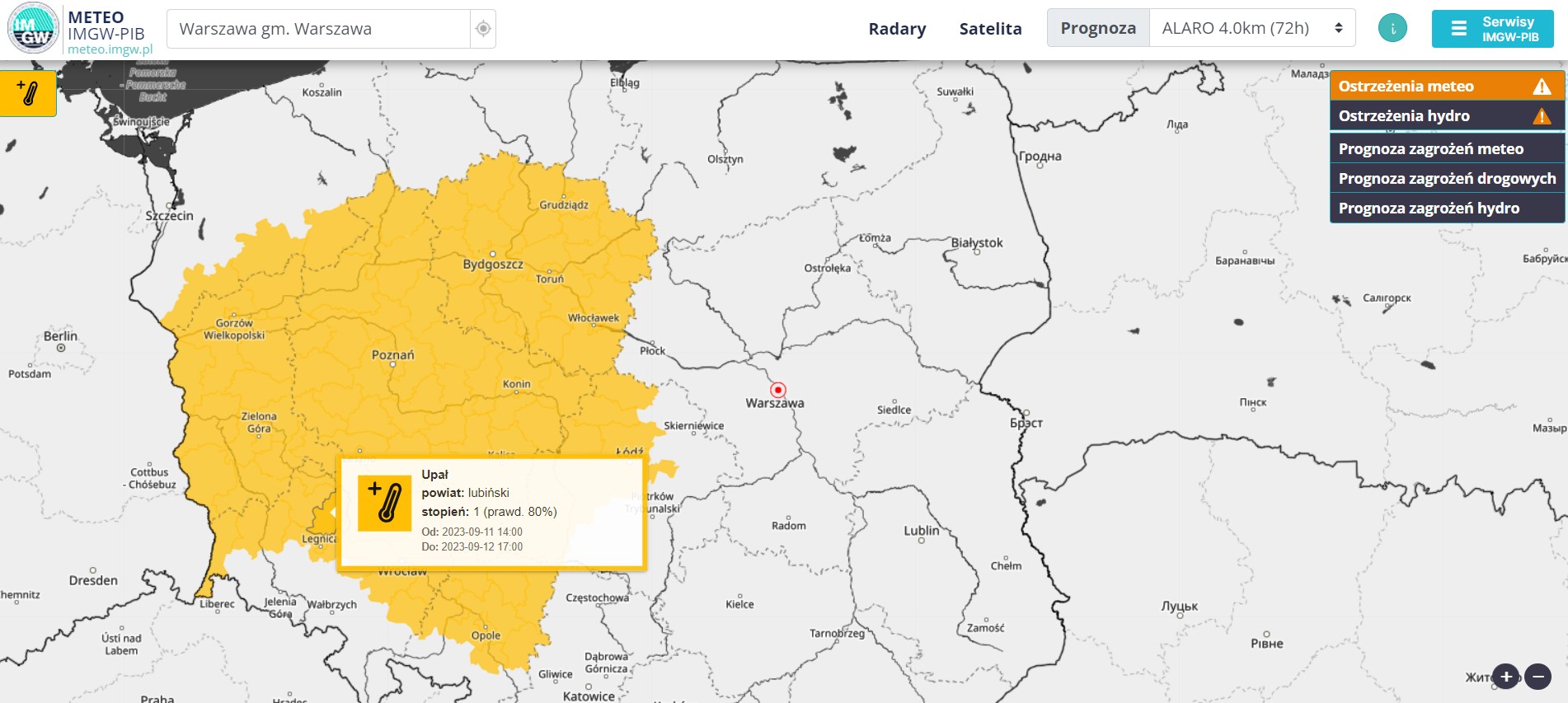 Instytut Meteorologii i Gospodarki Wodnej wydał ostrzeżenia przed upałami dla części zachodniej Polski, w tym dla powiatu lubińskiego.