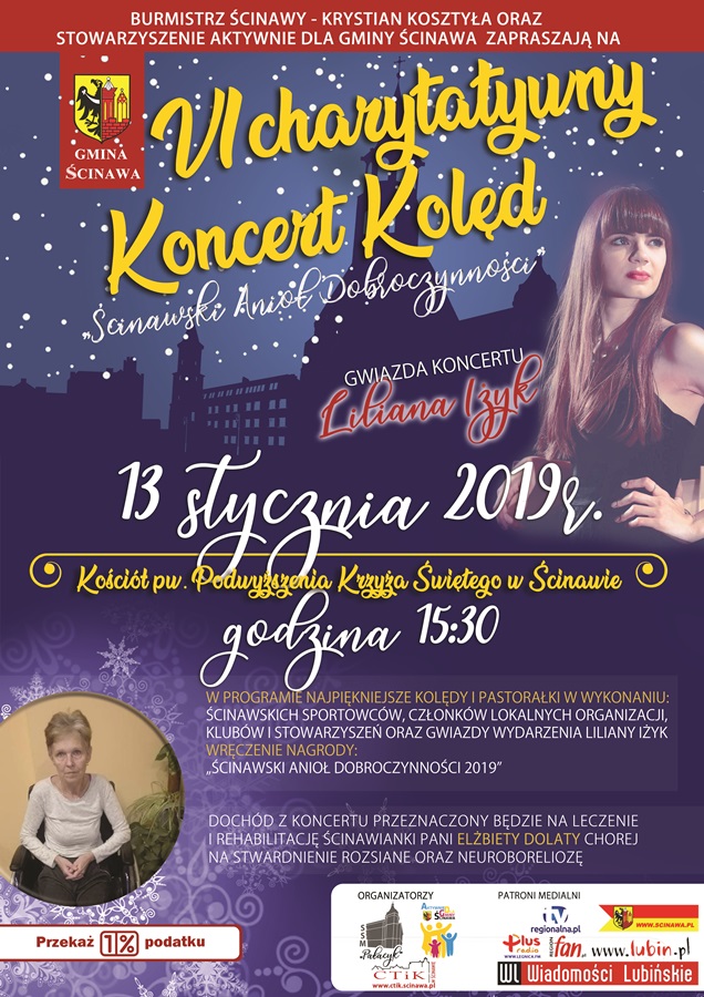 W trakcie VI charytatywnego Koncertu Kolęd koncertu usłyszymy najpiękniejsze kolędy i pastorałki w wykonaniu lokalnych grup i stowarzyszeń. Gwiazdą imprezy będzie sopranistka Liliana Iżyk. Ważnym wydarzeniem współtowarzyszącym będzie wręczenie nagrody „Ścinawski Anioł Dobroczynności”.