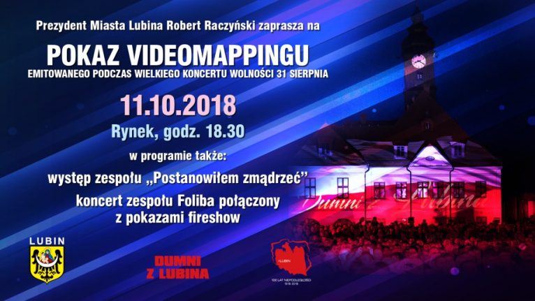 Ci, którzy nie widzieli pokazu videomappingu podczas Wielkiego Koncertu Wolności, będą teraz mieli okazję, by obejrzeć to niesamowite widowisko. Inni będą mogli przypomnieć sobie tamto wydarzenie. – Już w najbliższy czwartek, 11 października, zapraszamy wszystkich na lubiński rynek – zachęca Jacek Mamiński, rzecznik prezydenta Lubina.