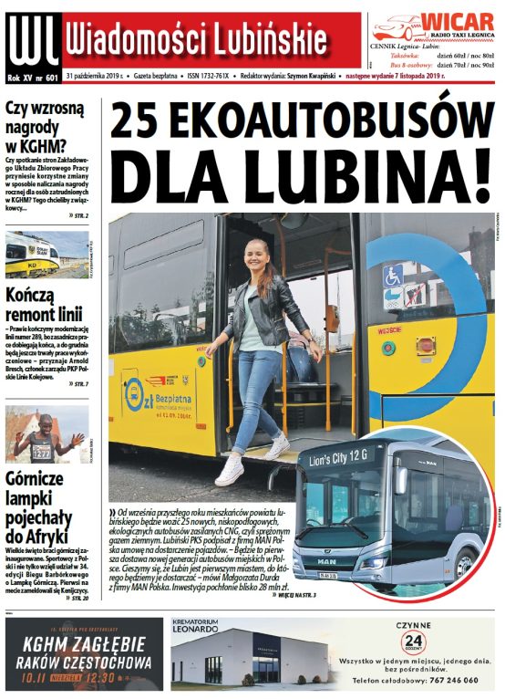 Lubiński PKS podpisał umowę z firmą MAN Polska na dostawę 25 nowych, ekologicznych autobusów niskopodłogowych nowej generacji. Pojazdy będą klimatyzowane i zasilane sprężonym gazem ziemnym, a po ulicach naszego powiatu zaczną jeździć od września przyszłego roku. Według nas to zdecydowanie najważniejszy temat, o którym piszemy w jutrzejszym wydaniu „Wiadomości Lubińskich”.