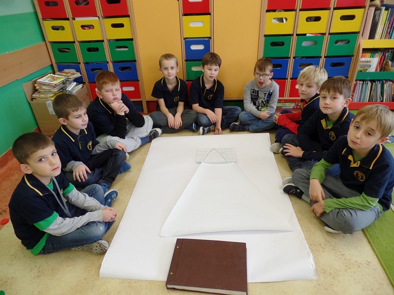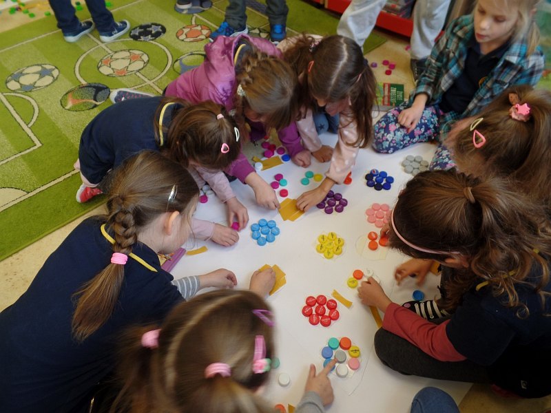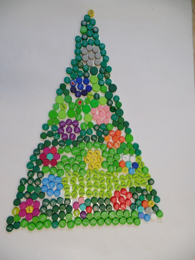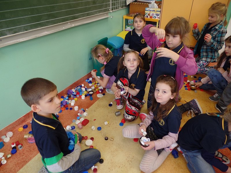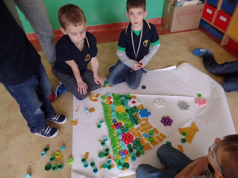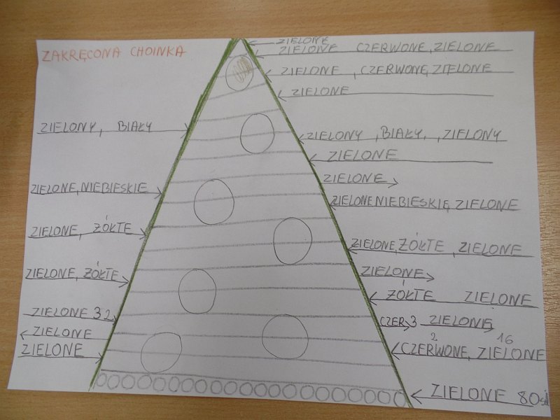 Plan pracy i podział czynności zaproponowali sami uczniowie. Pierwsza grupa uczniów posegregowała zakrętki według kolorów. Druga grupa zakodowała sposób przyklejania zakrętek, a trzecia przygotowała trójkąty z brystolu. Wszyscy uczniowie zapoznali się z kodem i sposobem przyklejania zakrętek. Wyklejane były dwie choinki, jedna chłopców i druga dziewczynek. Prace trwały trzy godziny i przyniosły dzieciom wiele radości, dały także możliwość doskonalenia umiejętności współpracy.