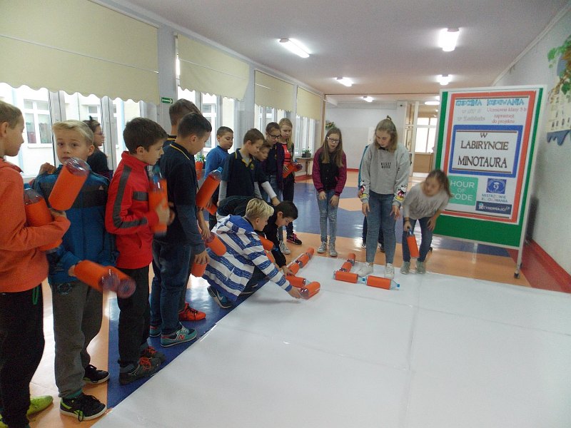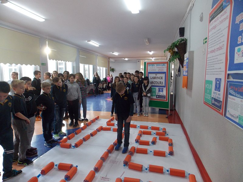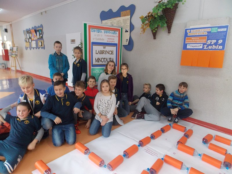 „W labiryncie Minotaura” to projekt, który realizowany był w SP nr 9 w ramach Godziny Kodowania. W czasie lekcji omawiano zasady korzystania z Internetu. Uczniowie z klasy V b wraz z nauczycielką Krystyną Węgrzyn ułożyli na korytarzu labirynt z butelek. Umieścili w nim pytania dotyczące Internetu. Później uczniowie innych klas odpowiadali na pytania i przechodzili przez labirynt. Obok dzieci powiesiły swoje plakaty z zasadami komunikacji przez Internet.