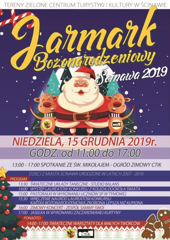 15 grudnia przy Centrum Turystyki i Kultury w Ścinawie pojawi się Jarmark Bożonarodzeniowy. Tego dnia odbędzie się również spotkanie z Mikołajem, który wręczy wszystkim grzecznym dzieciom prezenty.