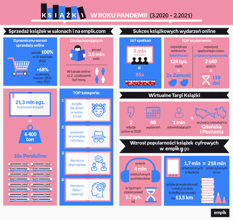 Ponad 21 mln sprzedanych egzemplarzy, blisko 4 miliony odsłuchanych audiobooków i podcastów – dane Empiku pokazują, że w pandemii Polacy bardzo chętnie spędzali czas z książką. Jednocześnie wzrosło znaczenie internetu w sprzedaży książek – w ciągu minionych 12 miesięcy liczba egzemplarzy zakupionych online zwiększyła się aż o 68% (a w ostatnim kwartale 2020 r. aż o 100%). Z kolei przeniesienie życia literackiego do sfery online zaowocowało dynamicznym rozwojem wydarzeń – w wirtualnych spotkaniach literackich wzięło udział 5 mln odbiorców.