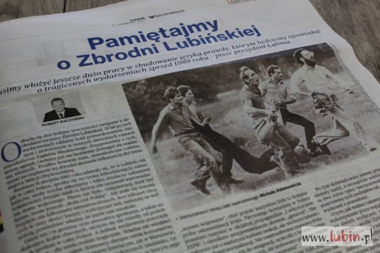 Z okazji rocznicy w „Rzeczpospolitej” ukazał się dziś artykuł poświęcony wydarzeniom z 31 sierpnia 1982 roku. To co się wtedy wydarzyło i o śmierci Andrzeja Trajkowskiego, Michała Adamowicza i Mieczysława Poźniaka przypomina prezydent Lubina Robert Raczyński.