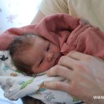 Nowo narodzona dziewczynka jest bardzo spokojna. Ukryta w ramionach taty nie przejmuje się wizytą dziennikarzy, obecnością kamery i aparatu fotograficznego.