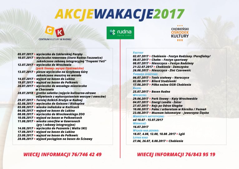 Urząd gminy Rudna, Centrum Kultury w Rudnej oraz Chobieński Ośrodek Kultury zapraszają wszystkich do skorzystania z bogatej oferty zajęć, wyjazdów i imprez przygotowanych z okazji wakacji. Szczegóły na plakcie poniżej oraz pod numerem telefonu: 76 843 95 19 lub 76 746 42 49.