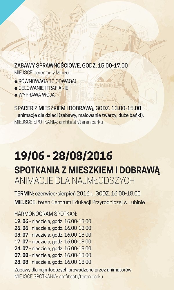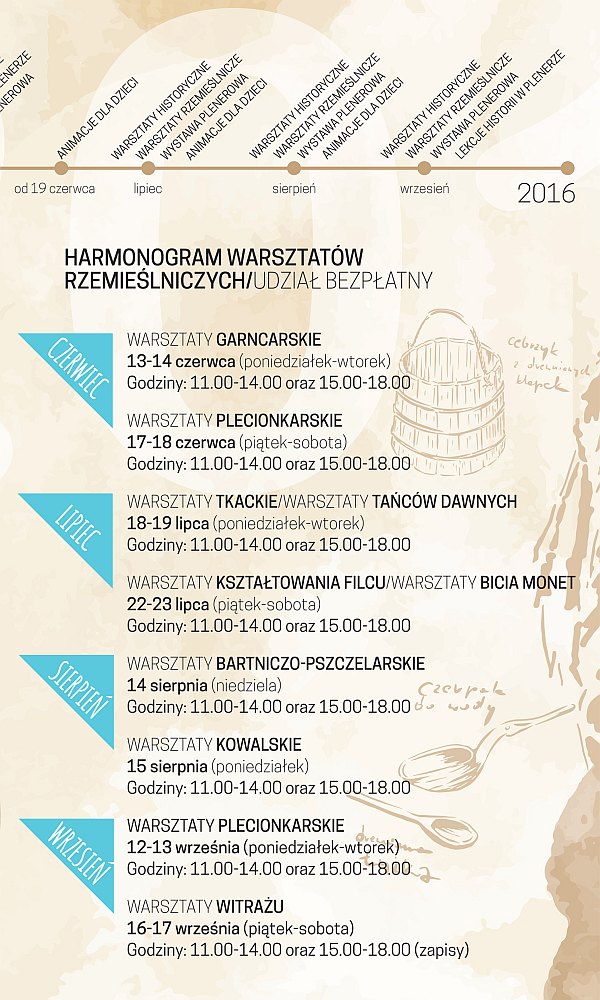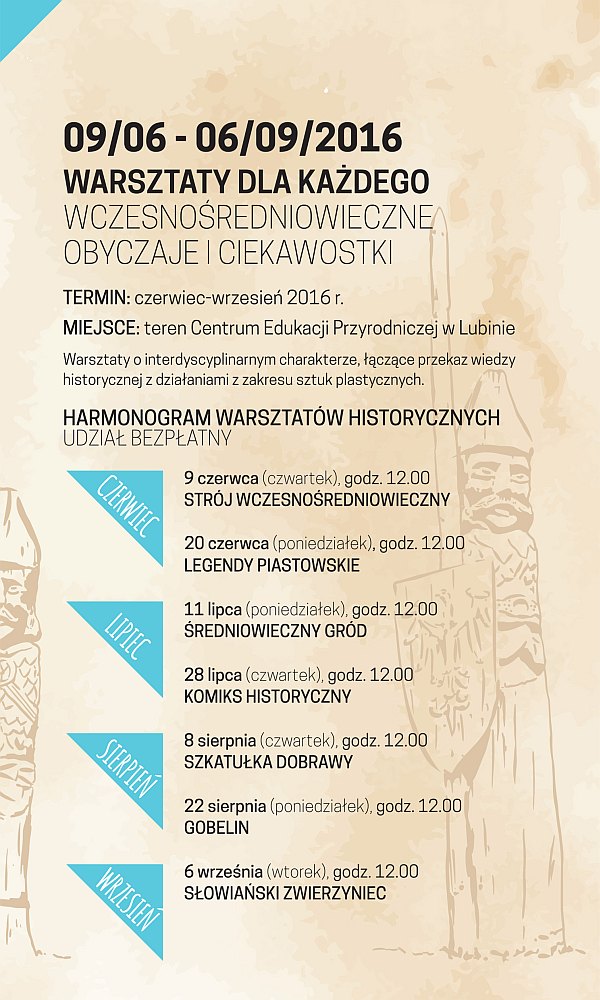 Ponadto każdy – i młodsi, i starsi – w czasie wakacji może wziąć udział w warsztatach historycznych oraz rękodzielniczych poświęconych średniowieczu. Kilka z nich już się odbyło, przed nami jeszcze zajęcia dotyczące średniowiecznego grodu, komiksu historycznego, szkatułki Dobrawy, czyli biżuterii oraz gobelinom i słowiańskim zwierzętom, a także tkackie, z kształtowania filcu, bartniczo-pszczelarskie, kowalskie, plecionkarskie i z witrażu. Szczegółowe harmonogramy zamieszczamy poniżej.