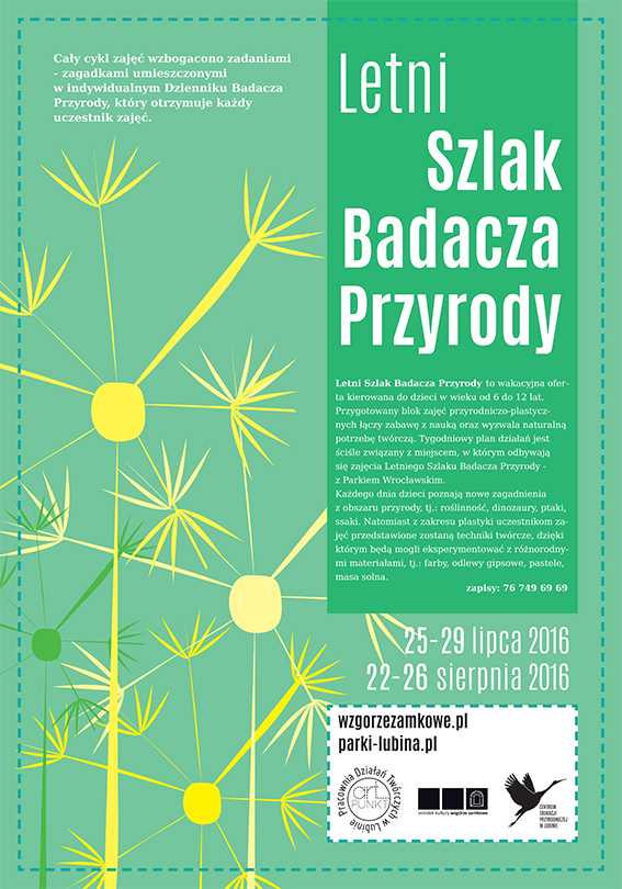 Letni Szlak Badacza Przyrody to cykl zajęć edukacyjno-plastycznych. Tematyka zajęć jest ściśle związana z miejscem, w którym się odbywają i podzielona na pięć bloków: rośliny, dinozaury, zwierzęta gospodarskie, ptaki dziko żyjące, ptaki w wolierach. Każdego dnia dominuje inna tematyka.
