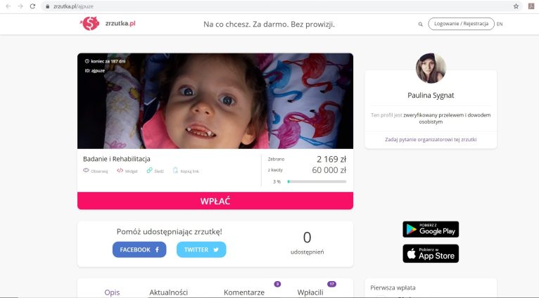 Wszystko, co uda się zgromadzić w tych trzech miejscach, zostanie przeznaczone na badania genetyczne oraz rehabilitację i leczenie małej lubinianki.