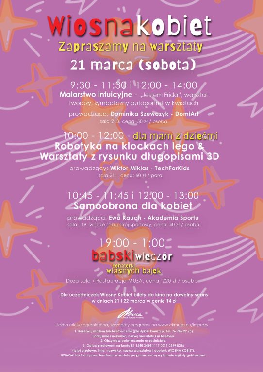 – I jeszcze jedna ważna informacja: podczas weekendu Wiosny Kobiet, to jest 21 i 22 marca, uczestniczki warsztatów, koncertu i Babskiego Wieczoru mogą wybrać się na dowolny seans w naszym kinie Muza, a za bilet zapłacą promocyjną cenę 14 zł – dodaje Krystyna Huzarewicz.