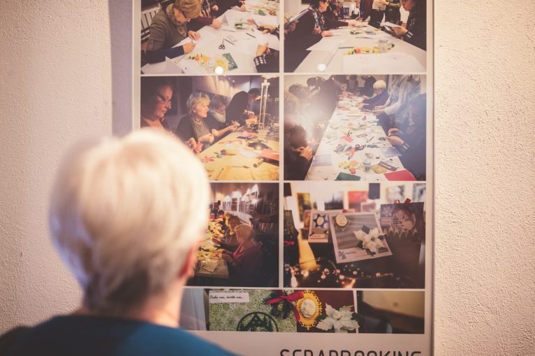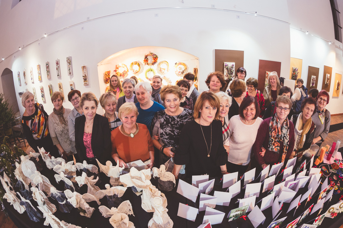 Szczególnie dużo radości wzbudzały plansze przedstawiające fotografie z warsztatów, na których każda z uczestniczących w zajęciach pań mogła się odnaleźć, a które gościom zapewniły wgląd w proces tworzenia prac wystawionych w galerii – witraży, jesiennych wianków i kolaży, kartek świątecznych, aniołów oraz stroików bożonarodzeniowych w kształcie choinek.