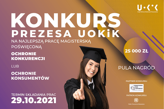 Prezes UOKiK przypomina o kolejnej edycji konkursu na najlepszą pracę magisterską oraz doktorską z zakresu ochrony konkurencji i ochrony konsumentów. Partnerem wydarzenia jest Stowarzyszenie Prawa Konkurencji, a patronem Polskie Towarzystwo Ekonomiczne.