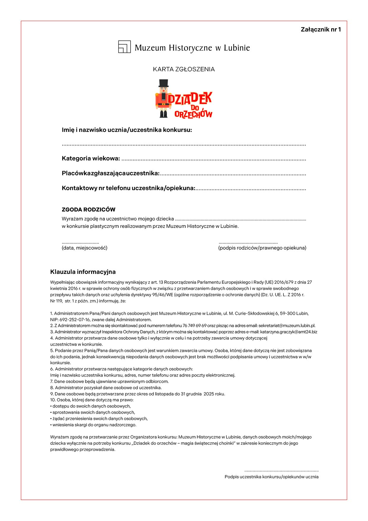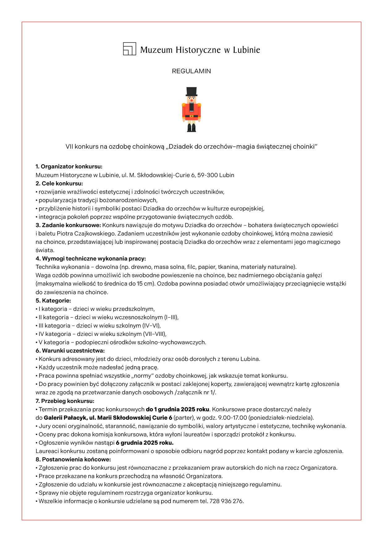 Gotowe prace należy dostarczyć do 1 grudnia 2025 roku do Galerii Pałacyk przy ulicy Marii Skłodowskiej-Curie 6 w godzinach od 8.00 do 16.00. Do każdej ozdoby trzeba dołączyć zaklejoną kopertę, zawierającą kartę zgłoszenia oraz zgodę na przetwarzanie danych osobowych.