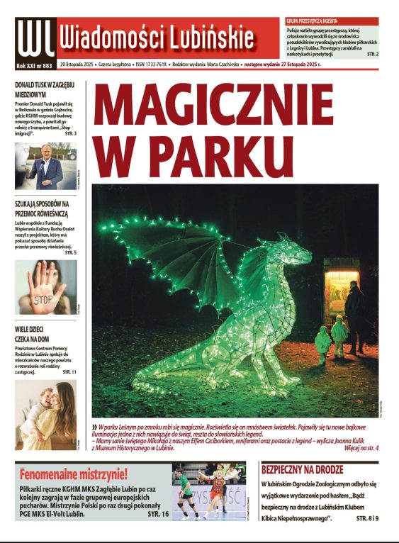 W nowym wydaniu najstarszego bezpłatnego lubińskiego tygodnika piszemy również o: wizycie premiera Donalda Tuska, który przyjechał do Zagłębia Miedziowego, listach do Mikołaja napisanych przez lubińskich seniorów, nowym projekcie miasta Lubin, który ma pomóc w walce z przemocą rówieśniczą czy wystawie starych pocztówek prezentujących nasze miasto.