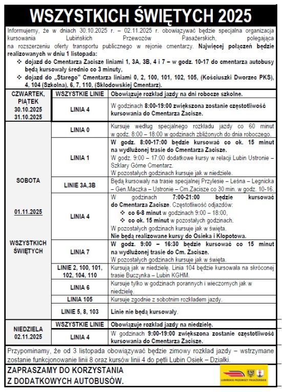 Zmiany wprowadzono po to, by usprawnić dojazd do cmentarzy w Lubinie. Wiele osób, by uniknąć kłopotów z zaparkowaniem auta przy cmentarzu, przesiądzie się zapewne do bezpłatnej komunikacji publicznej. Szczególnie w dniu Wszystkich Świętych autobusy będą częściej dojeżdżać w okolice nekropolii.