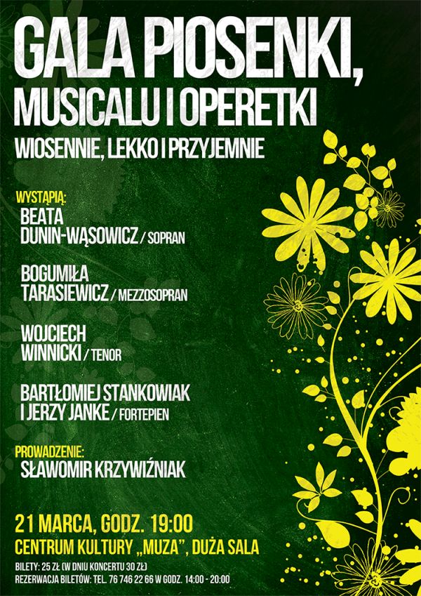 Zapowiada się wiosennie, lekko i przyjemnie. Już 21 marca w dużej sali Centrum Kultury Muza rozbrzmiewać będą piosenki znane i lubiane, również z musicalu oraz operetki.