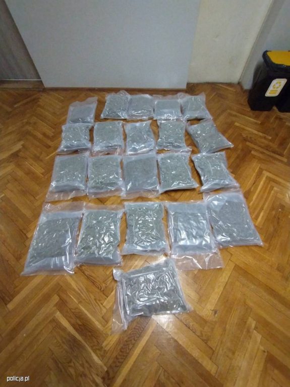 21 kg marihuany znaleźli lubińscy policjanci w samochodzie 29-letniego Jakuba W. Natomiast w jego pokoju hotelowym w Krakowie była kokaina i dwie sztuki broni. Mężczyzna został tymczasowo aresztowany.