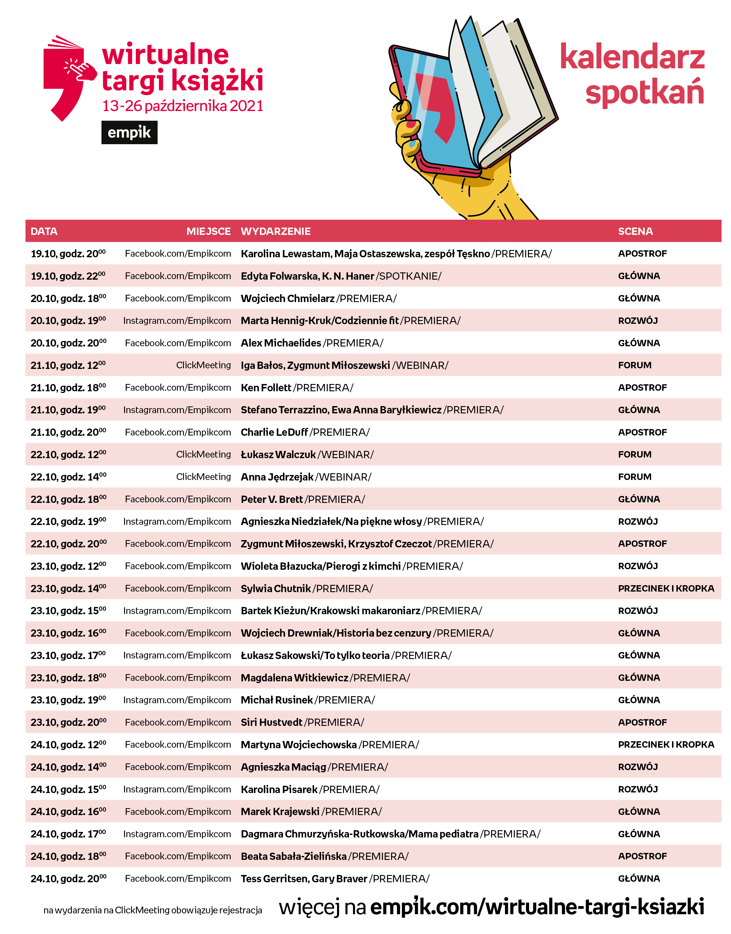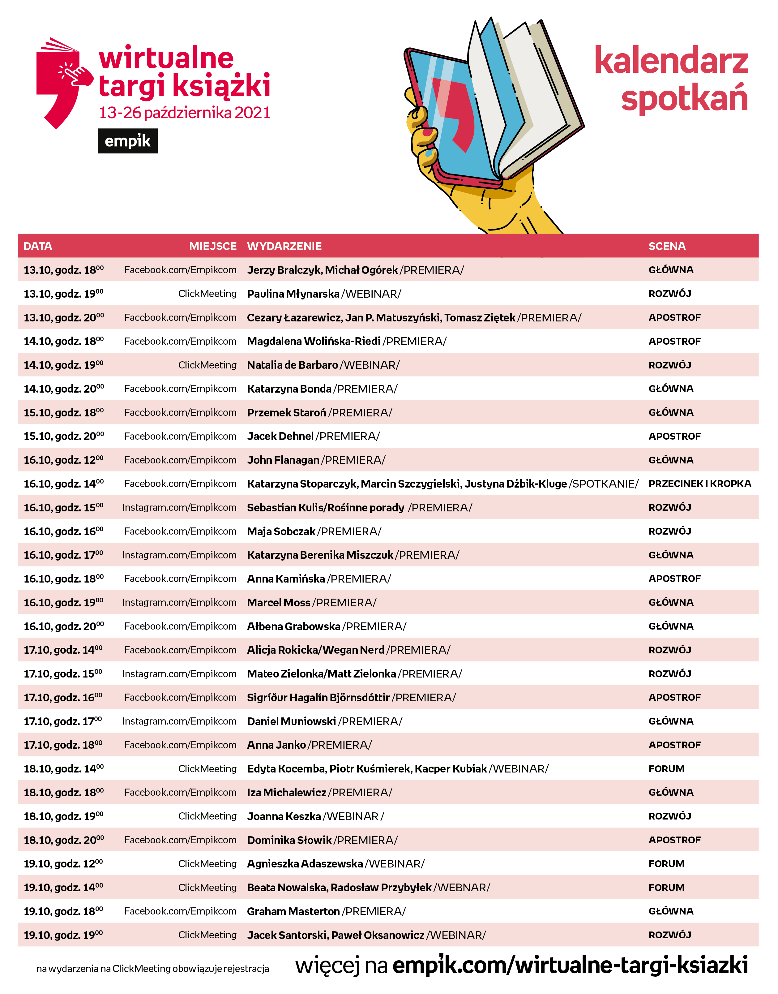 Wirtualne Targi Książki odbędą się 13-26 października online na: www.empik.com/wirtualne-targi-ksiazki oraz w aplikacji mobilnej Empik. Spotkania będą transmitowane na profilu Empiku na Facebooku (tłumaczone na język migowy), Instagramie oraz na YouTube. Udział w webinarach Sceny Rozwój oraz Forum jest możliwy po wcześniejszej rejestracji na platformie ClickMeeting.