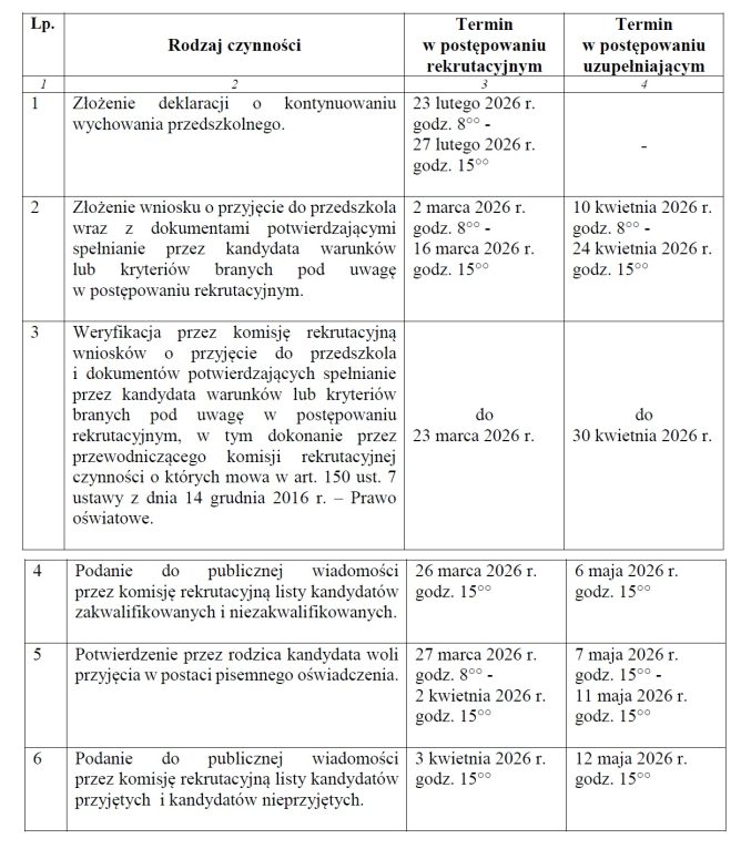 Podania będzie można składać do 16 marca. Po tym jak przedszkola wywieszą listy zakwalifikowanych i niezakwalifikowanych (26 marca), rodzice będą mieli chwilę na potwierdzenie, że ich dziecko będzie uczęszczało do danej placówki (od 27 marca do 2 kwietnia). Później odbędzie się rekrutacja uzupełniająca.
