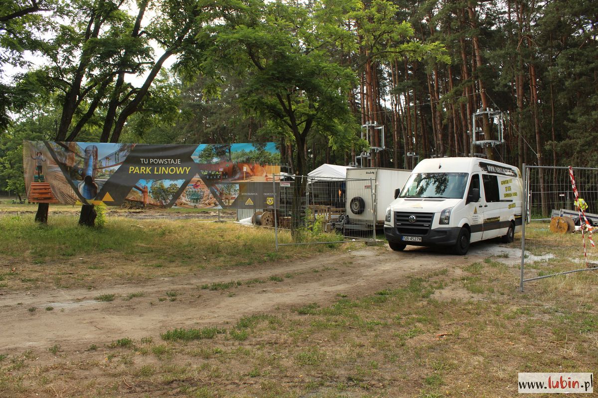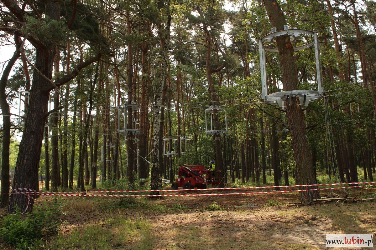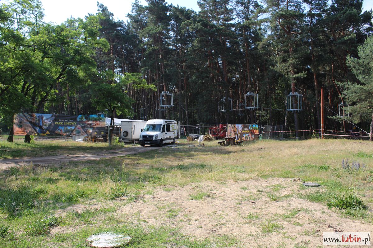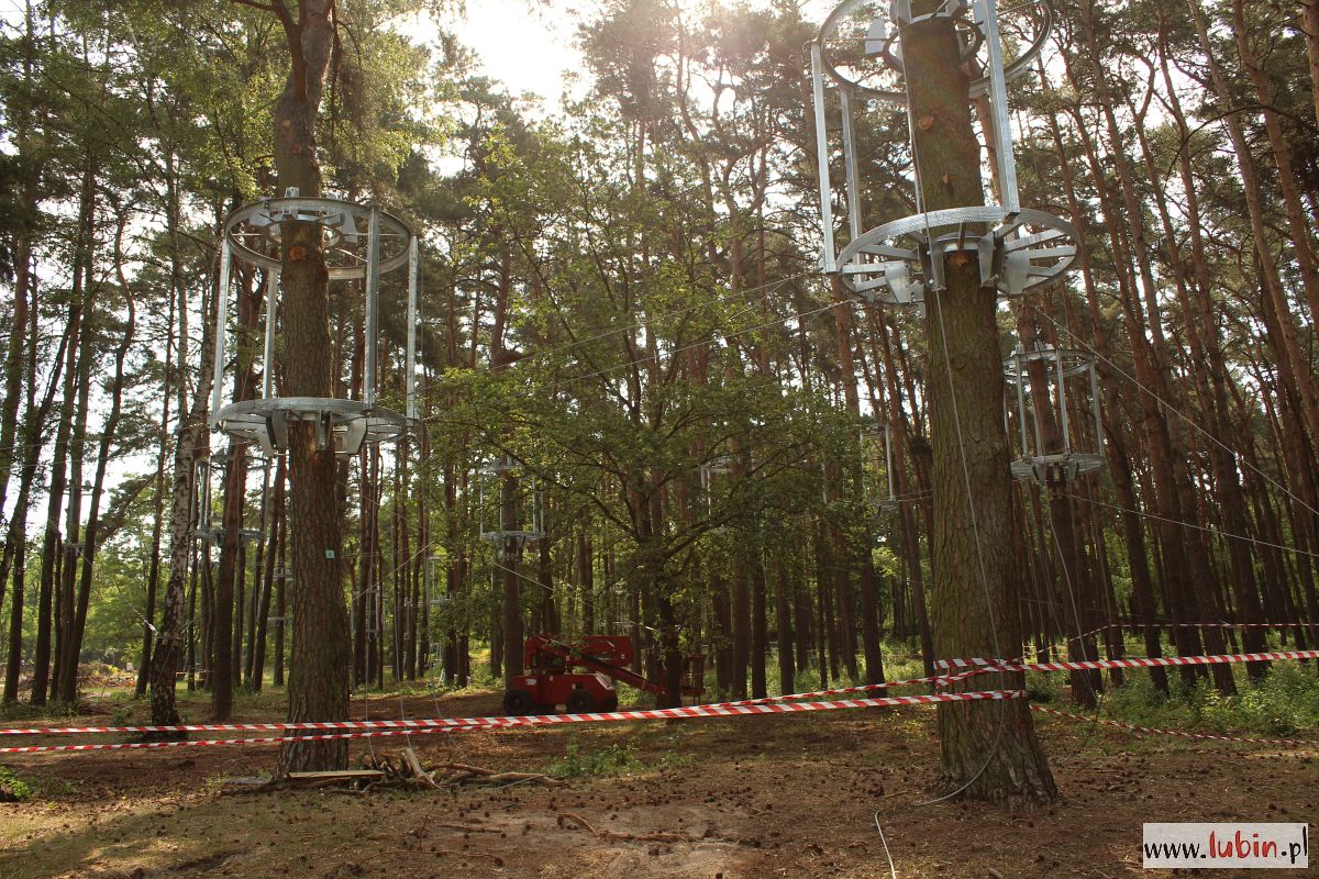 Na drzewach w parku Leśnym właśnie montowane są metalowe konstrukcje, które będą stanowiły domki-bazy, dla tych którzy będą w przyszłości bawili się w tym parku linowym. Instalowane są na dwóch wysokościach: 4 i 6 metrów. Lubiński park linowy będzie się bowiem składał z dwóch tras na różnych wysokościach. Każda trasa będzie miała po 130 metrów długości i będzie posiadała przeszkody o różnym stopniu trudności. Na końcach każdej z tras staną wieże ze zjeżdżalniami. Całość będzie wyposażona w siatki bezpieczeństwa.