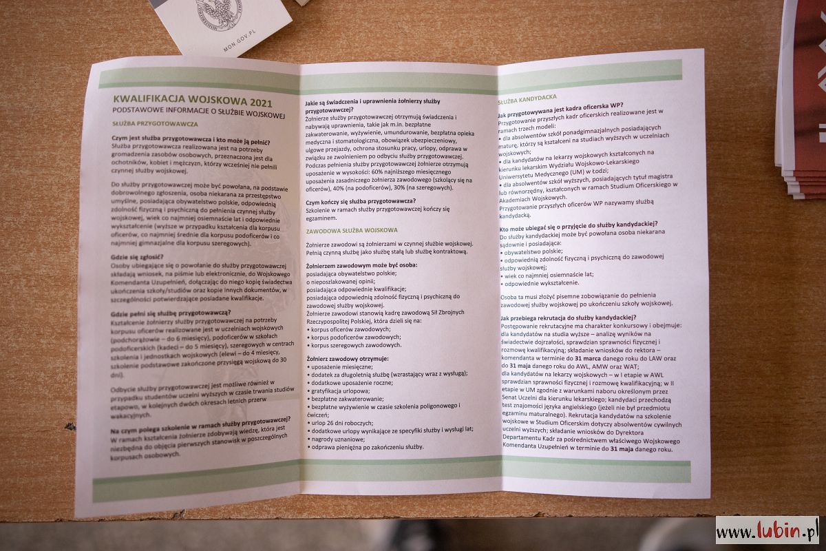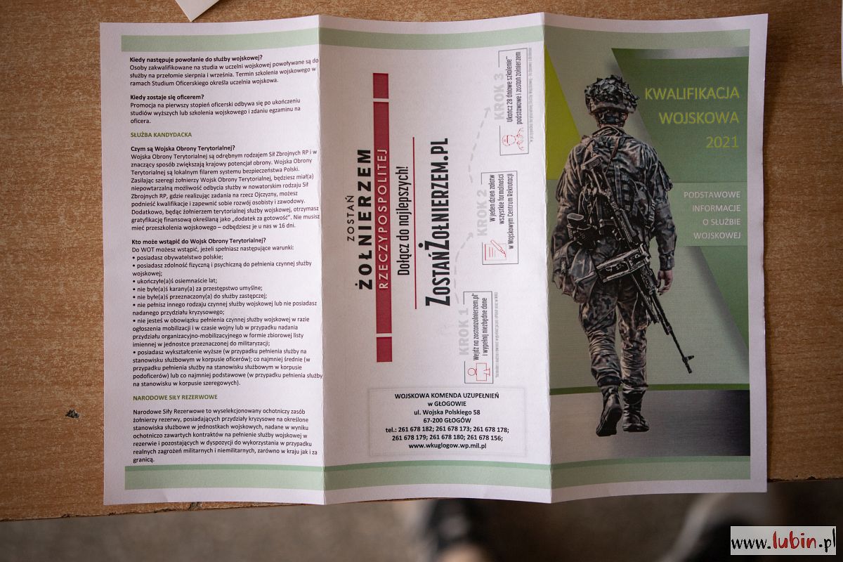 Kwalifikacja potrwa do 13 maja. Na pierwszy ogień poszli młodzi mieszkańcy Lubina. Później, od 23 do 29 kwietnia kwalifikację wojskową przejdą mieszkańcy gminy wiejskiej Lubin, od 30 kwietnia do 5 maja – Ścinawy, a od 6 do 10 maja – gminy Rudna. Jeden dzień – 11 maja – wyznaczono dla kobiet. I na koniec dwa dni na doprowadzenia osób, które się nie stawiły.