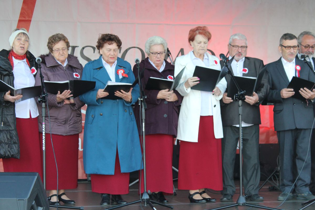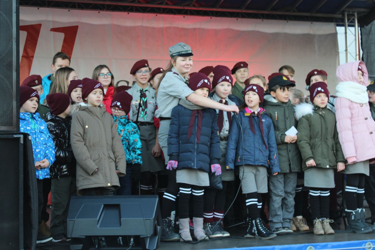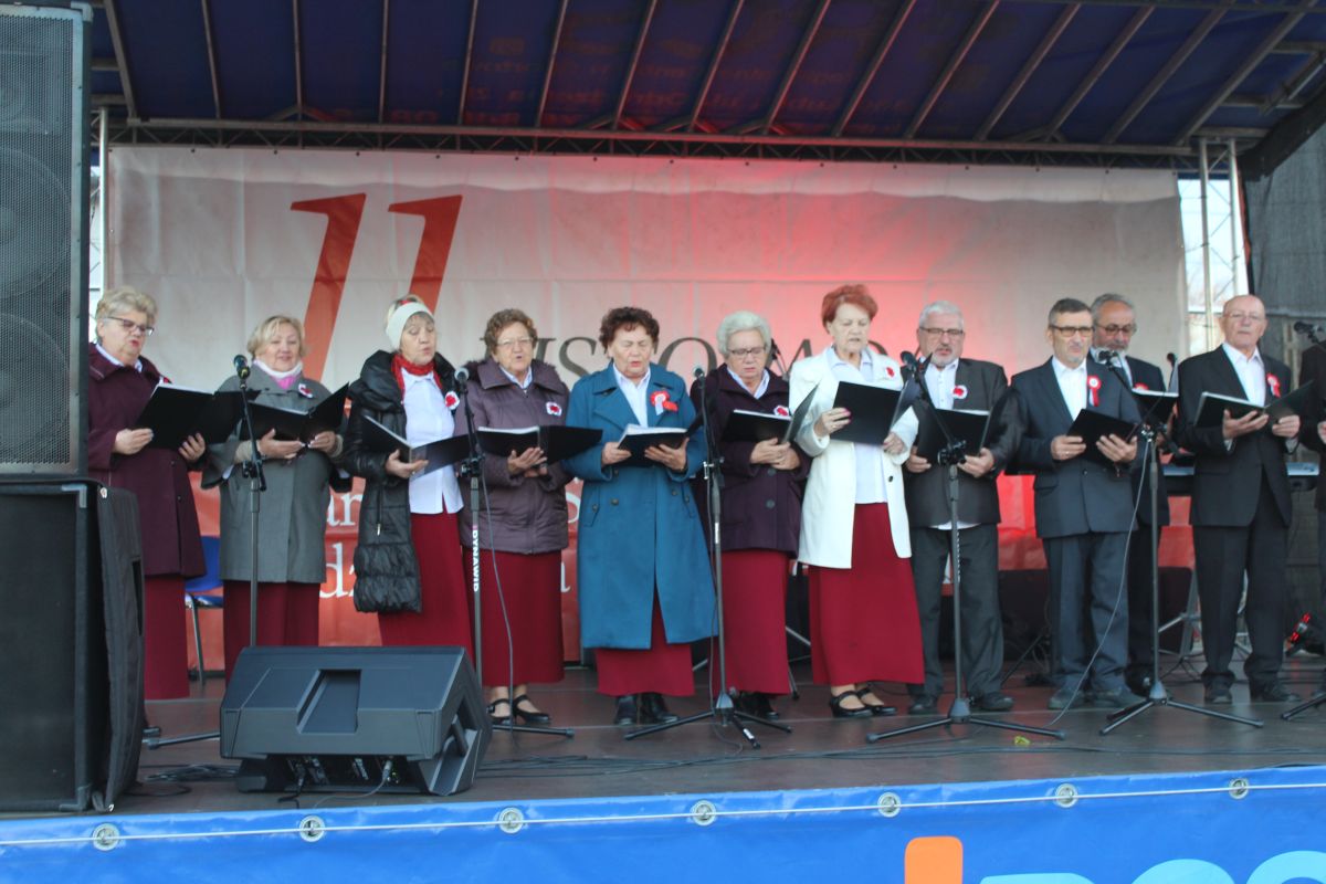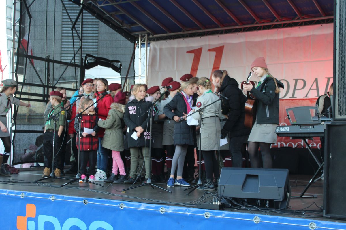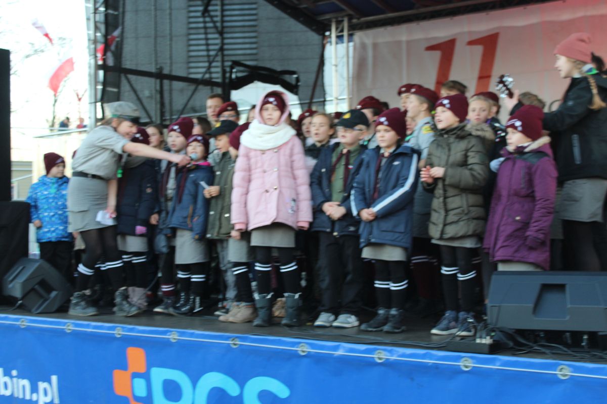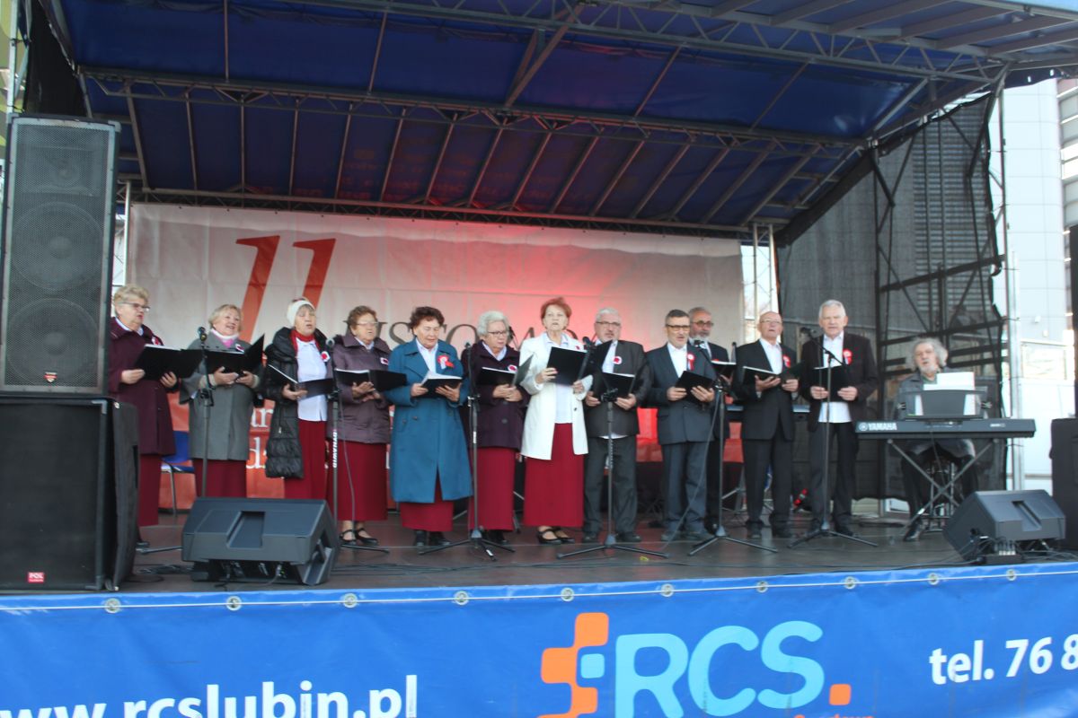 Tuż przed schodami prowadzącymi do hali RCS rozłożono niewielką scenę, na której swoje zdolności artystyczne, a zwłaszcza wokalne, prezentowały różne grupy. Publiczność oklaskiwała m.in. lubińskich harcerzy czy podopiecznych Domu Dziennego Pobytu „Senior” w Lubinie. Naturalnie w repertuarze dominowały utwory o charakterze patriotycznym, wszak to właśnie dziś obchodzimy 101. rocznicę odzyskania przez Polskę niepodległości. Muzycznie był to jednak dopiero przedsmak tego, co od godz. 16.30 działo się już w samej hali, a o czym przeczytacie w naszym następnym artykule.