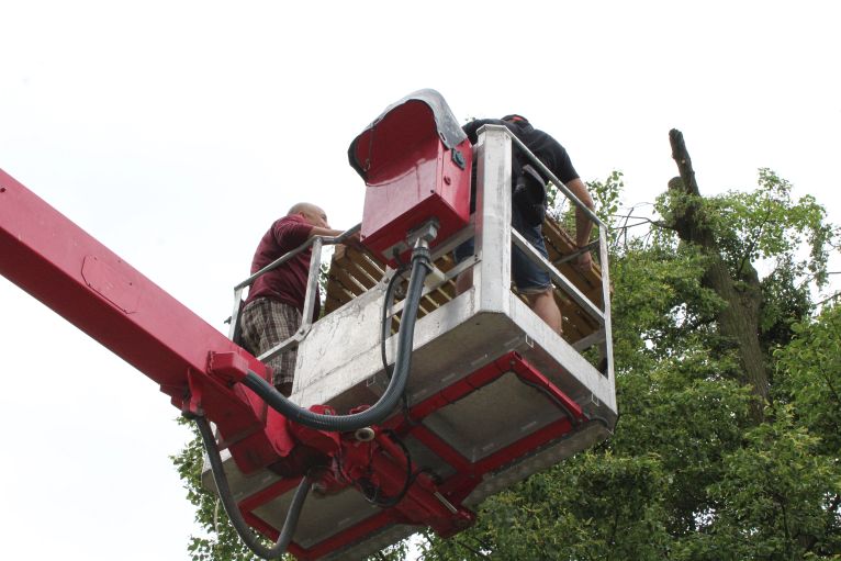 Gniazdo dla bocianiej rodziny zwieńczyło dziś koronę jednego z drzew na obrzeżach Rudnej. Mieszkanie dla ptaków w swoim wolnym czasie wykonał lubinianin Jan Demczuk, pracownik Zakładu Wzbogacania Rud.