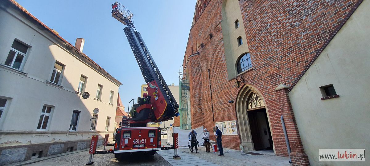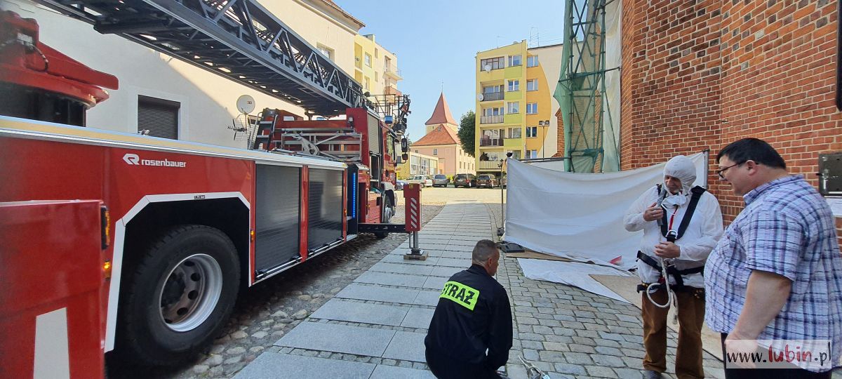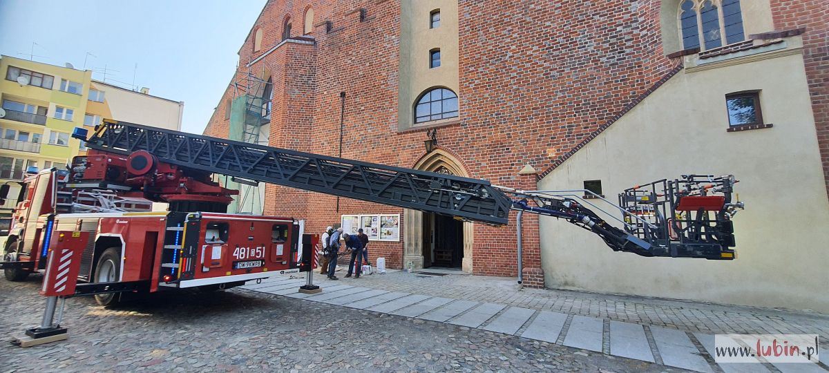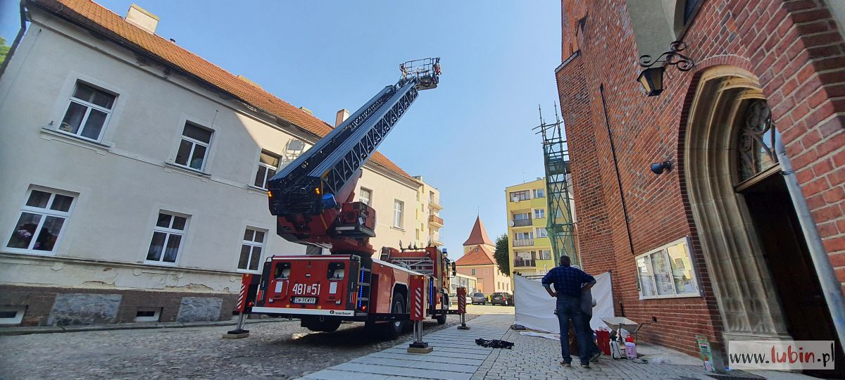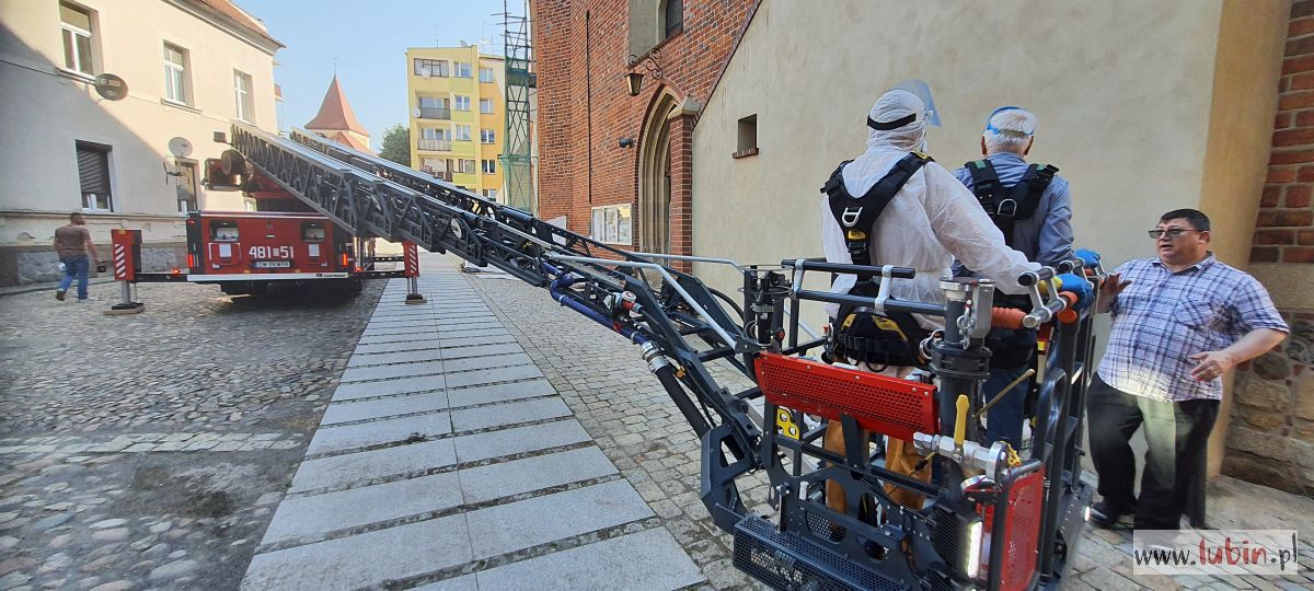 Wóz strażacki, stojący przed kościołem pw. Matki Bożej Częstochowskiej, zaintrygował dziś rano mieszkańców centrum miasta. – Ta strażacka drabina wysunięta jest pod sam szczyt kościoła, w koszu są ludzie i to nie strażacy. A to na pewno kilkadziesiąt metrów nad ziemią – zauważa jedna z mieszkanek, która z balkonu obserwowała całą sytuację.
