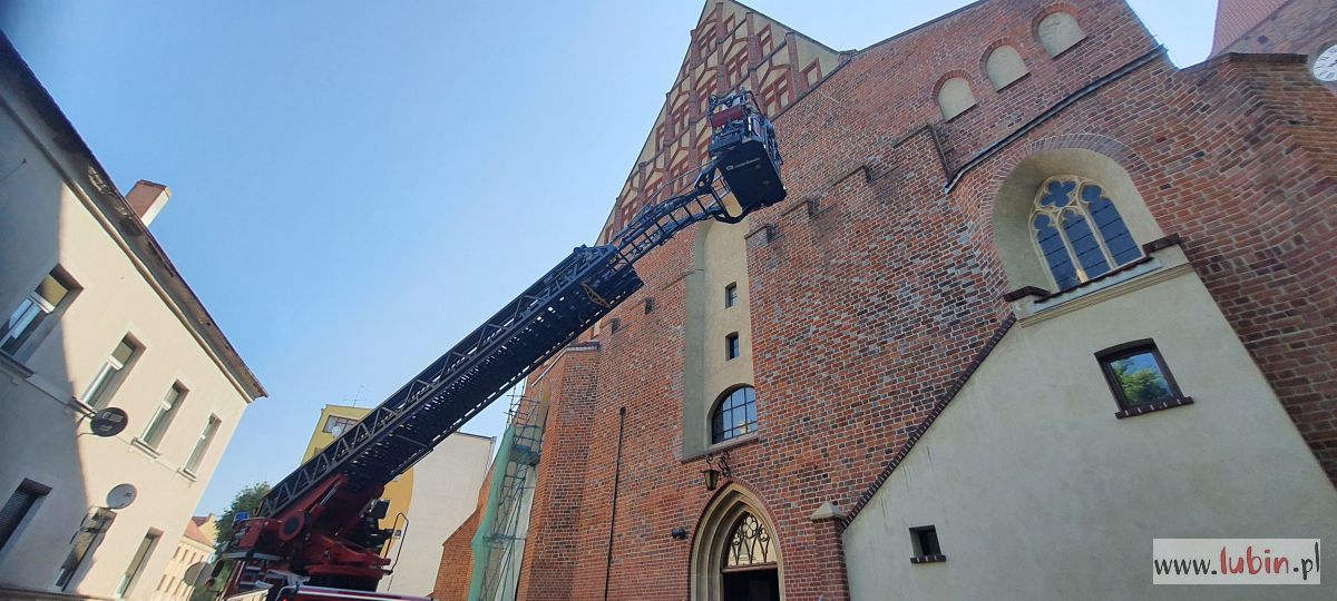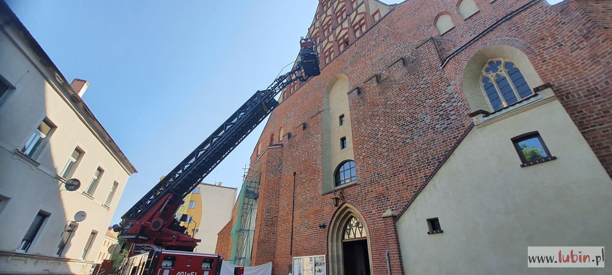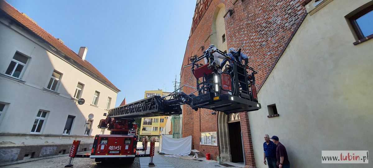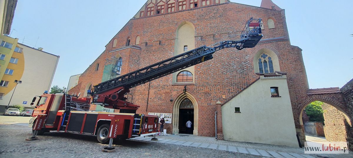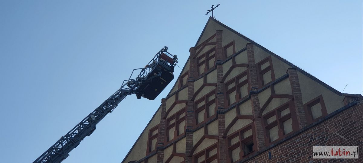 Wóz strażacki, stojący przed kościołem pw. Matki Bożej Częstochowskiej, zaintrygował dziś rano mieszkańców centrum miasta. – Ta strażacka drabina wysunięta jest pod sam szczyt kościoła, w koszu są ludzie i to nie strażacy. A to na pewno kilkadziesiąt metrów nad ziemią – zauważa jedna z mieszkanek, która z balkonu obserwowała całą sytuację.