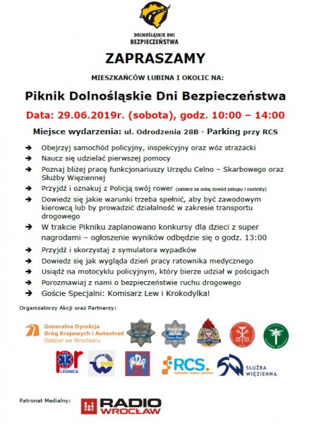Tę imprezę dla mieszkańców Lubina i okolic zorganizowali lubińscy policjanci wspólnie z Generalną Dyrekcją Dróg Krajowych i Autostrad. Do działań na rzecz bezpieczeństwa włączyły się również inne służby ratunkowe i instytucje, czyli straż pożarna, pogotowie, Inspekcja Transportu Drogowego, służba celno-skarbowa, służba więzienna oraz Regionalne Centrum Krwiodawstwa i Krwiolecznictwa, a także Wojewódzki Ośrodek Ruchu Drogowego.